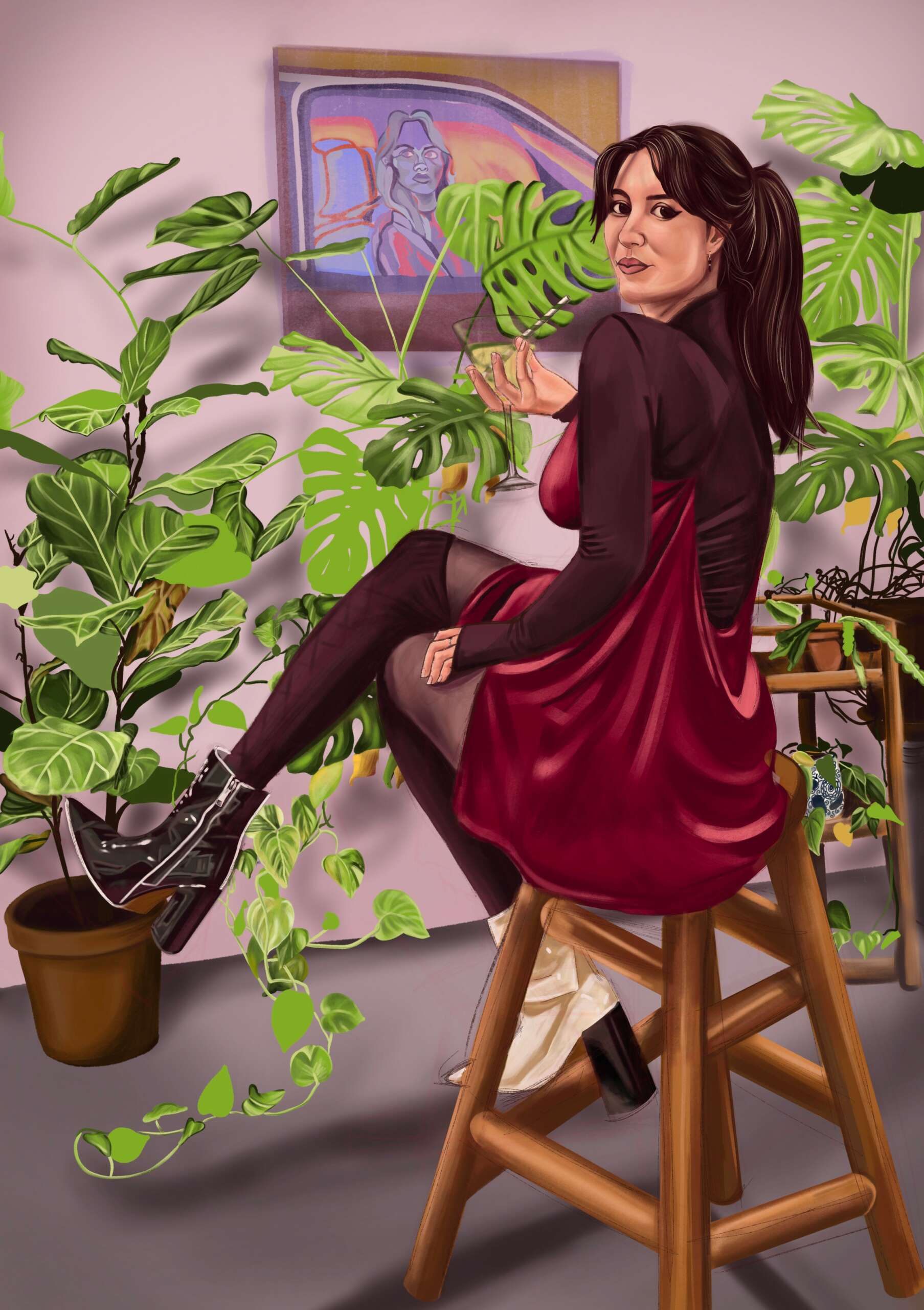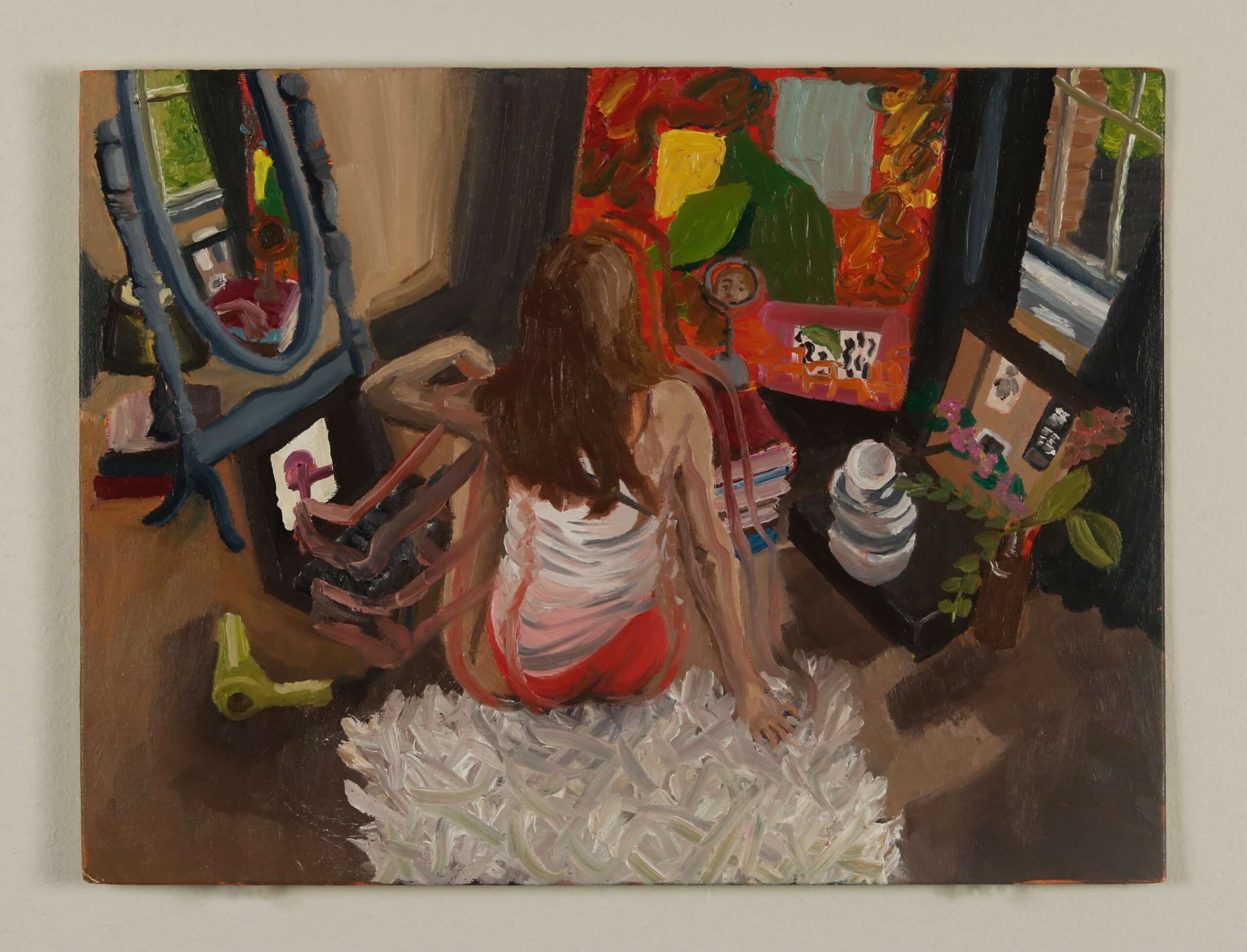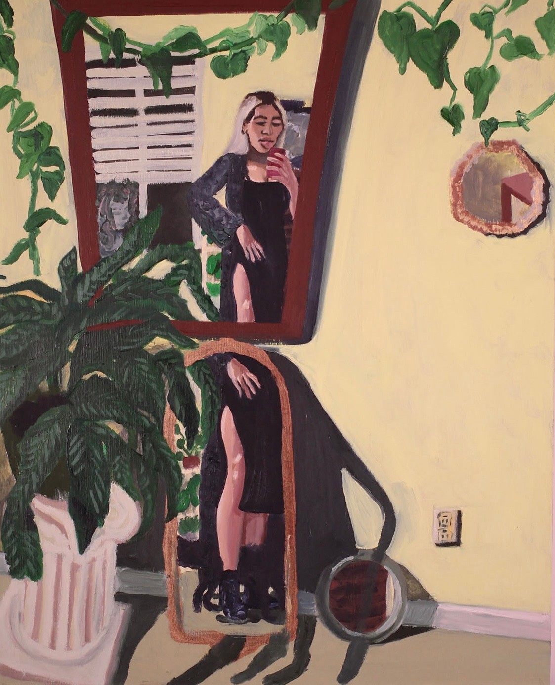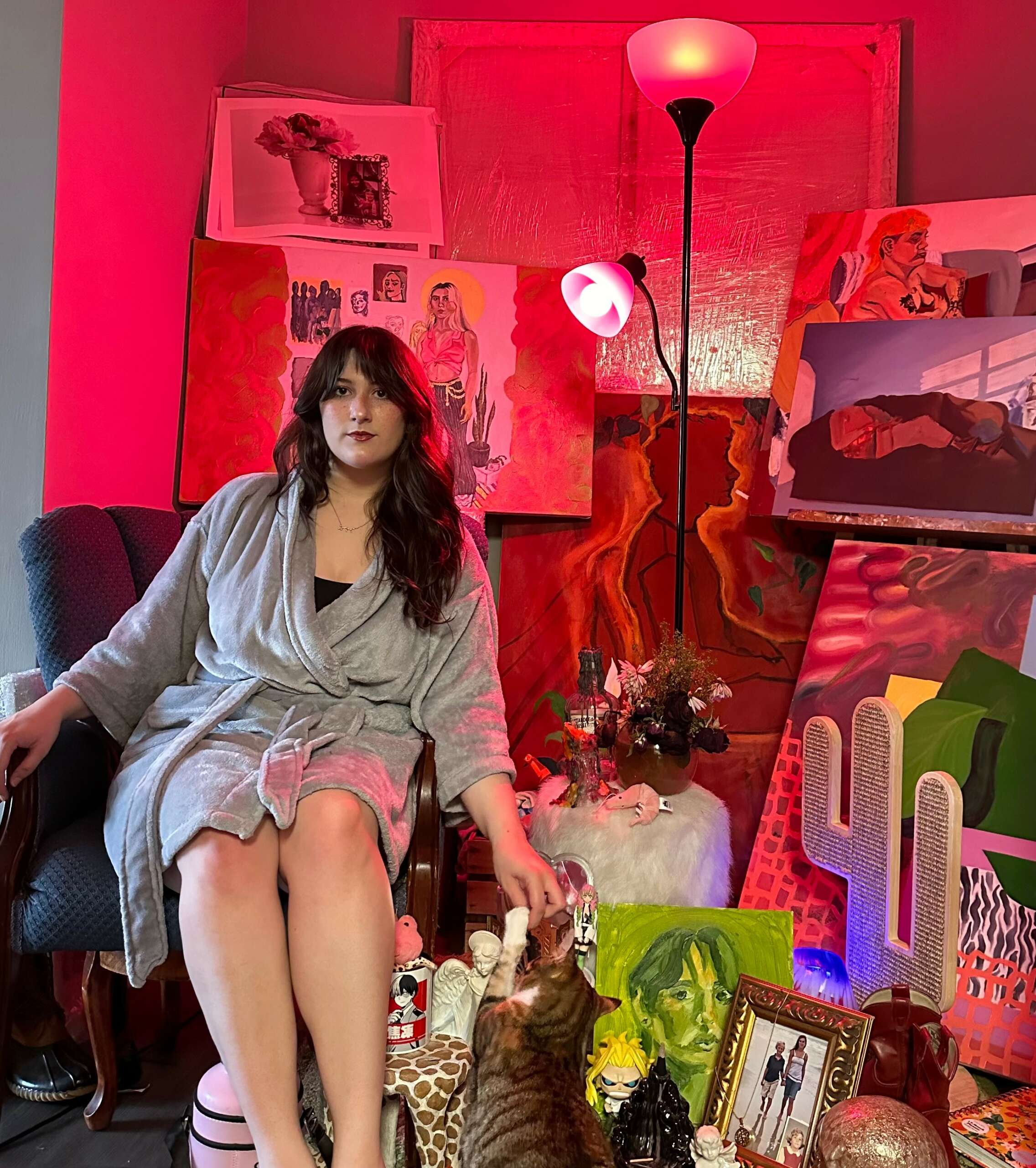 This isn’t necessarily a goal, but I use my art to aid in my journey of self-discovery. My experiences, relationships, and emotions are what really drive my work. I am heavily influenced by my relationships with others and the love I share for them. My self-portraits tell a story about how I am feeling during that time in my life, or past feelings I’ve had about events in my life. I intentionally pose myself with specific objects, outfits, lights, etc. which I often repeat in my work. The process in making my paintings involves a lot of self-reflection and connections I make in how I view myself or how certain events in my life have impacted me. It’s about how I’ve grown and evolved into the person I am today and how I will continue to do so in my life.