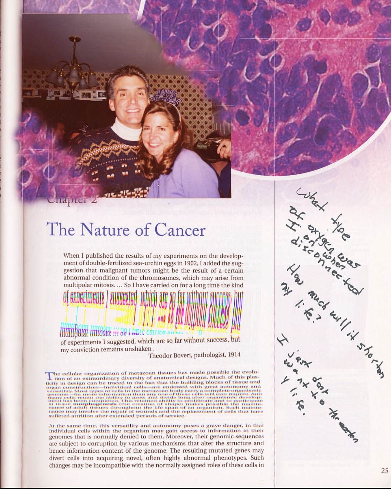 In undergrad, I did a research project focusing on cancer and loss. This topic weighs heavy on my heart, as I lost my mother to colon cancer when I was 8. My project explored this experience, especially my grief from it. Images of cancer cells influenced my work, both in photographs and paintings. Then, I reconstructed the images to convey a different perspective, mood, or emotion. I also incorporated subtle themes of sarcasm and dark humor as a nod to some of my coping mechanisms. This project was healing for me and helped my grieving process. It also allowed me to reconnect with my mom and my memories.