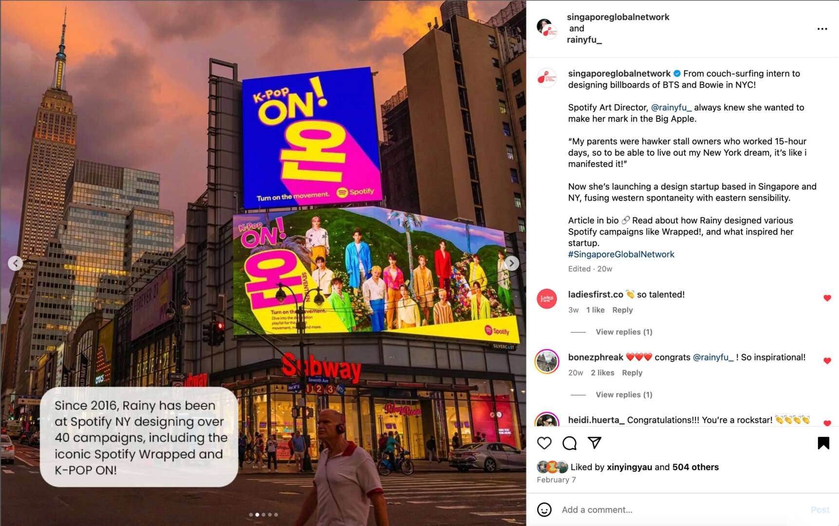 These experiences fueled my confidence, culminating in the founding of Design Never Sleeps, a Brand & Design Consultancy based in NYC and Singapore, in 2023. Working at Spotify as a Sr. Art Director has helped me to understand the blueprint of crafting the brand of a startup/tech company into what we now know as the culture-driven brands. One of my proudest moment is building a brand like K-Pop ON!, a global cultural zeitgeist with 5 mil followers. My team and I have assisted businesses in constructing their brands and positioning them at the forefront of culture. Now, rather than giant billboards in Times Square reserved for Fortune 500 brands, I can help smaller companies realize that aspiration through Design Never Sleeps, guiding them in brand positioning and crafting their company’s brand roadmap. My ultimate goal is to help companies achieve the impossible – where billboards in Times Square are now within reach.