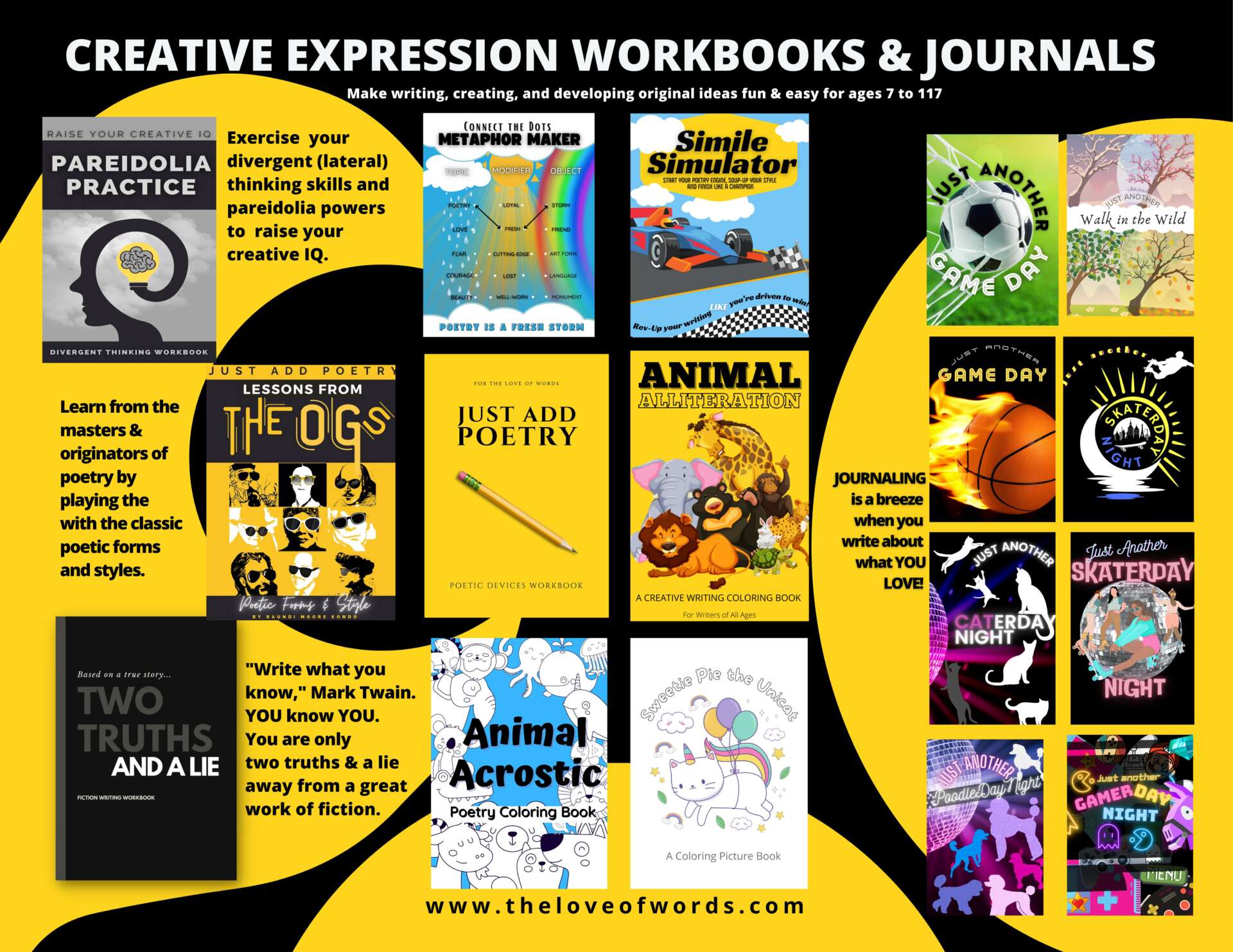 Other titles in the Creative Expression series, like Metaphor Maker and Simile Simulator, promote poetic license and the use of figurative language, which are some of the toughest concepts for younger readers and writers to grasp. My most recent publication is a love letter to the OG’s of Poetry. Just Add Poetry: Lessons from the OGs is the workbook I am most proud of. As long as I have been teaching classic poets like Basho and Angelou, I have wanted to create a curriculum similar to the Meet The Masters art program taught in schools. I am extremely proud of all of our publications and look forward to future publications to promote the love of words and writing.