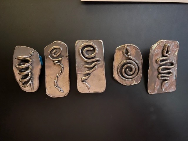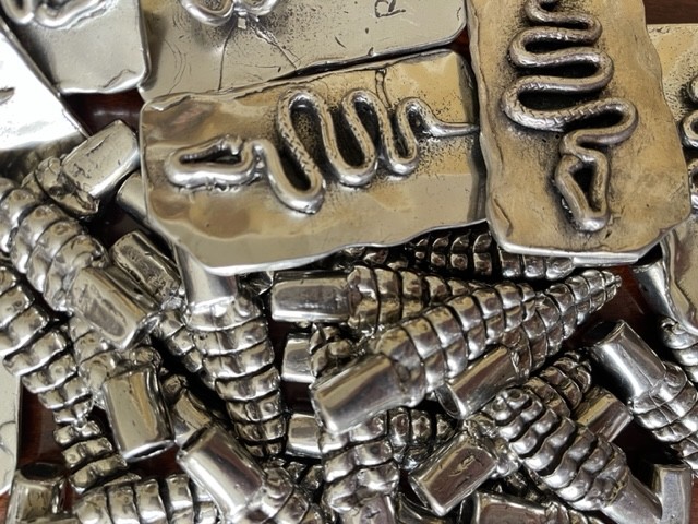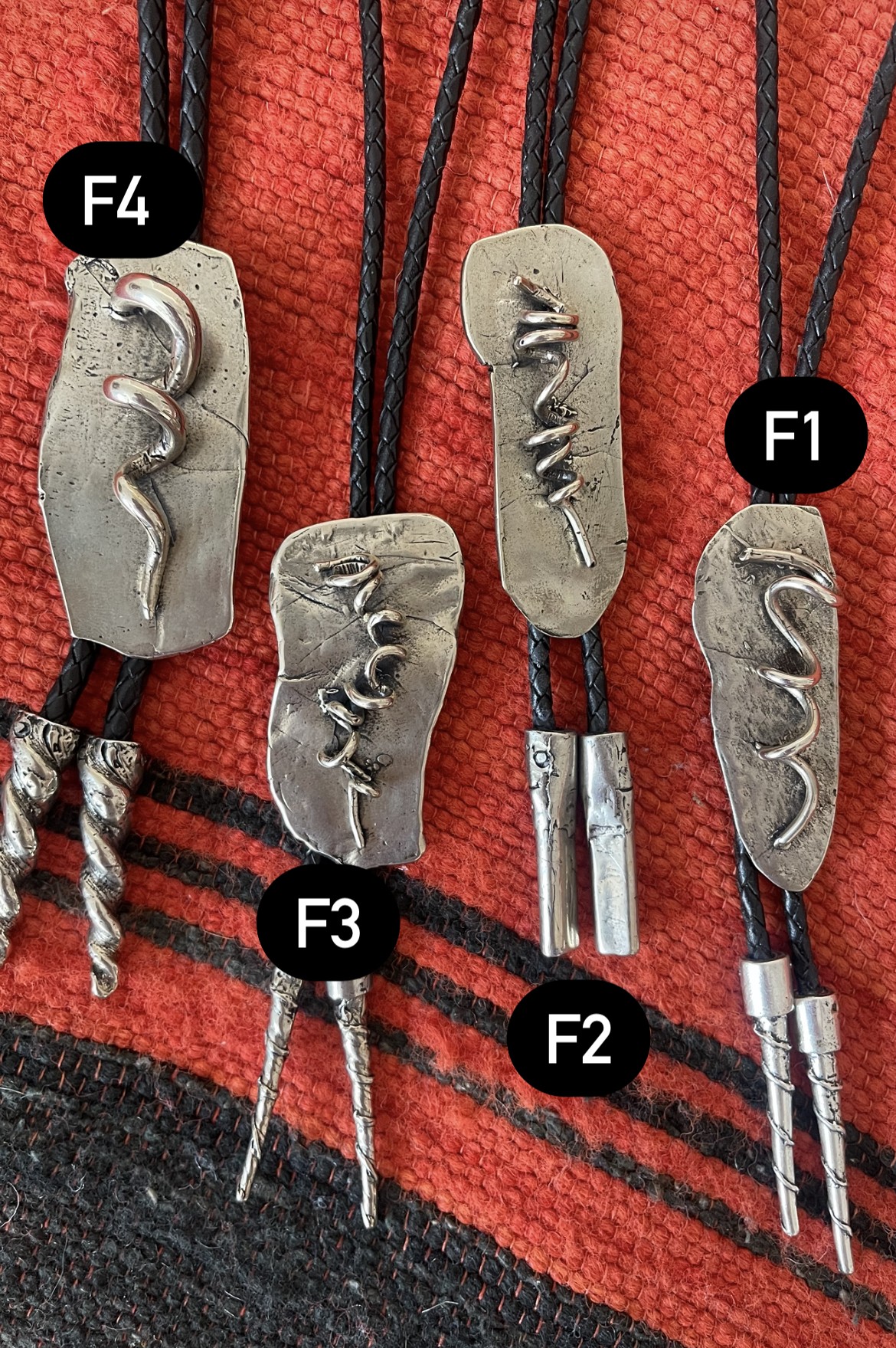 I next cast 5 abstract styles of Tornado Bolo’s, F-1 thru F-5. “F” refers to the Fujita nomenclature used to categorize tornado intensity based on damage caused to man made structures and vegetation. More recently, I’ve cast 3 new Tornado designs, and am working on 3 Bolos with a Rattlesnake theme. The tips of these snake bolos were cast using molds made of actual West Texas rattlesnake rattles.