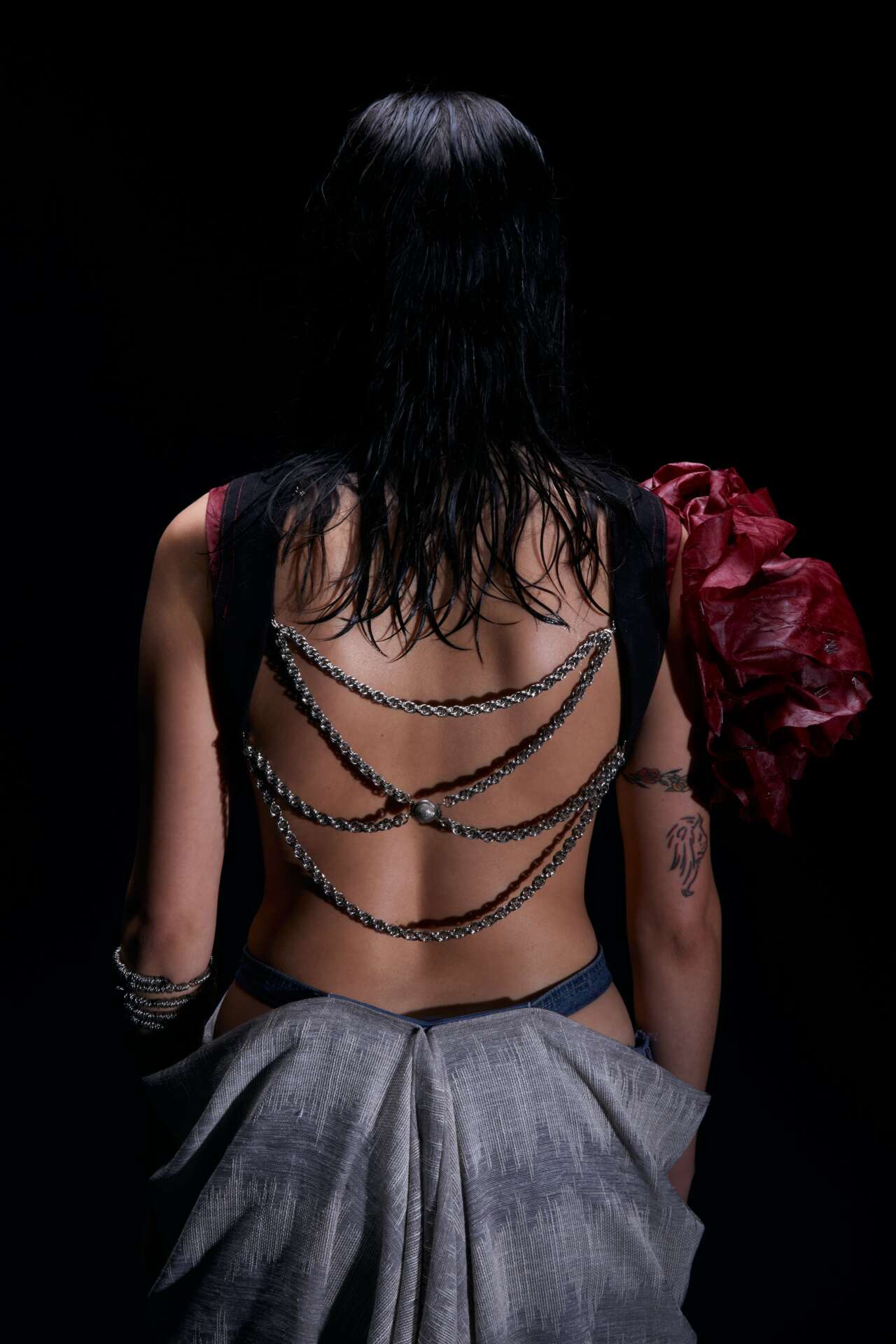 My name is Rickie Tang, I am a Chinese Canadian. In June, I graduated from Savannah College of Art and Design with a major in Fashion Design. My graduation collection “the party will go on.” best represents my work. It reflects on the bi-polarizing positions within society; the glamourous parties in the hills and the grungy underground ragers. Although the circumstances are different, there is a commonality, the party will go on. No matter what disaster is occurring in the world or personal conflict someone may be experiencing, people often resort to instant gratification and fabricated things. Forget about the chaos in the world. Let’s live in the moment because we may not be here for a long time but we’re here for a good time and riding hands-free for the night. The entire collection is upcycled with an emphasis on sustainability while highlighting the contrast qualities of raw and refined, hard and soft, and masculinity and feminity.