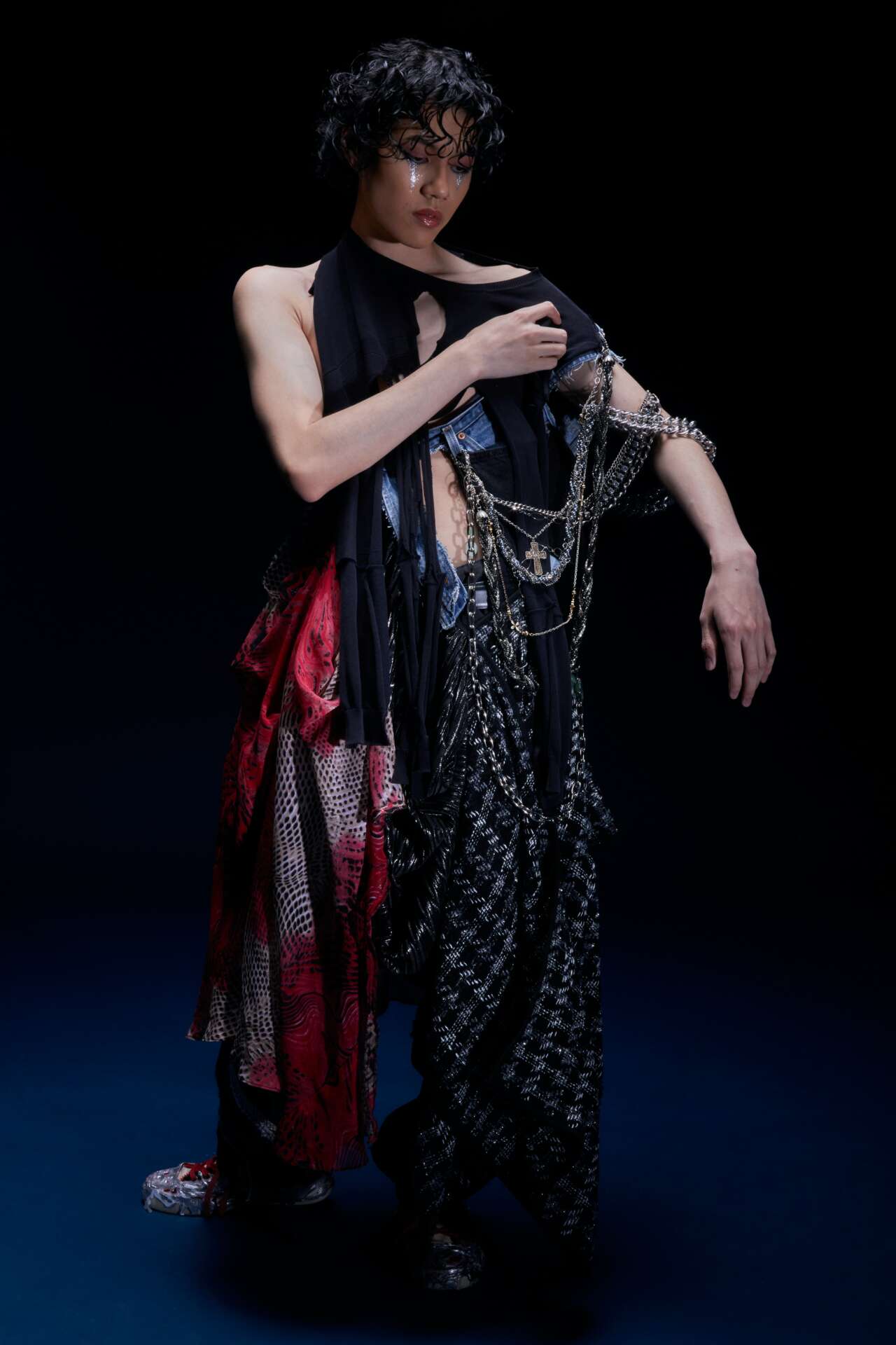 My name is Rickie Tang, I am a Chinese Canadian. In June, I graduated from Savannah College of Art and Design with a major in Fashion Design. My graduation collection “the party will go on.” best represents my work. It reflects on the bi-polarizing positions within society; the glamourous parties in the hills and the grungy underground ragers. Although the circumstances are different, there is a commonality, the party will go on. No matter what disaster is occurring in the world or personal conflict someone may be experiencing, people often resort to instant gratification and fabricated things. Forget about the chaos in the world. Let’s live in the moment because we may not be here for a long time but we’re here for a good time and riding hands-free for the night. The entire collection is upcycled with an emphasis on sustainability while highlighting the contrast qualities of raw and refined, hard and soft, and masculinity and feminity.