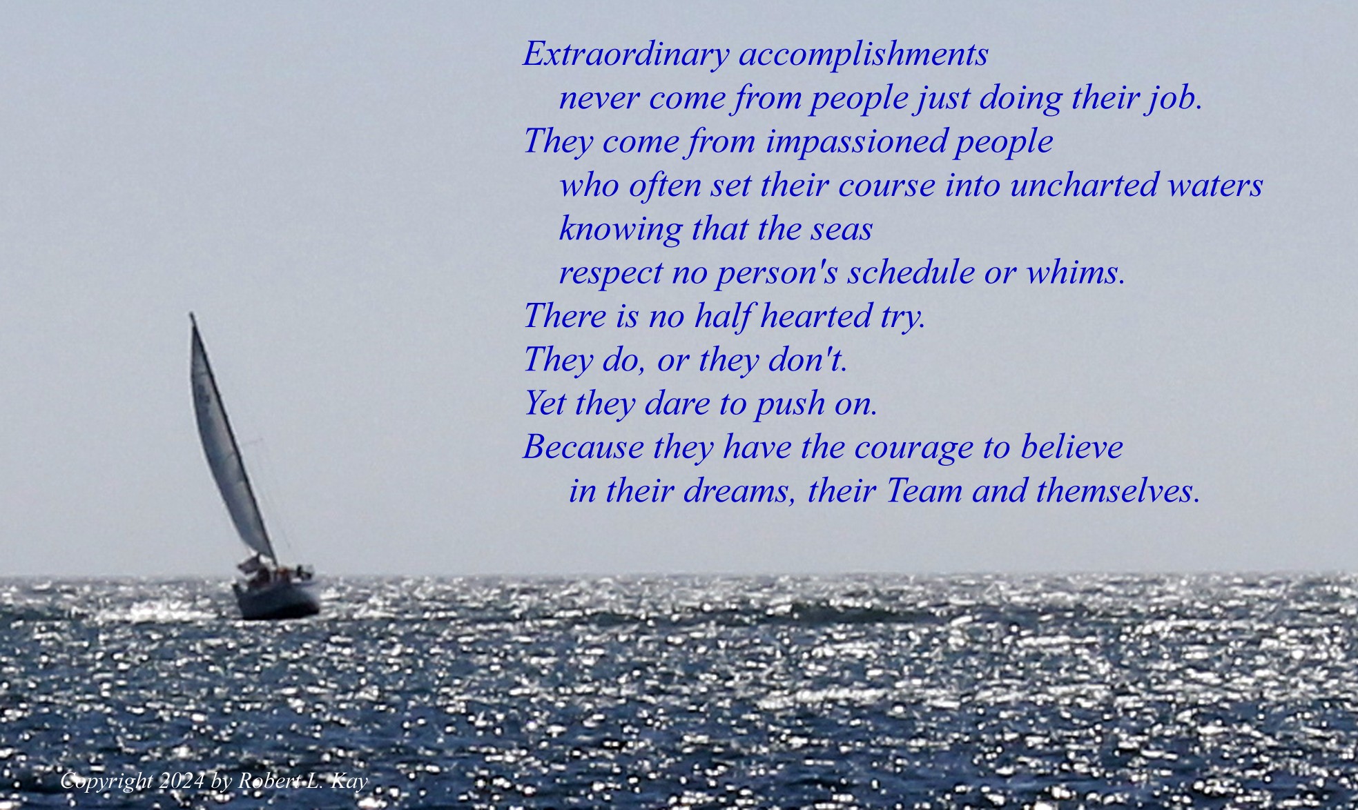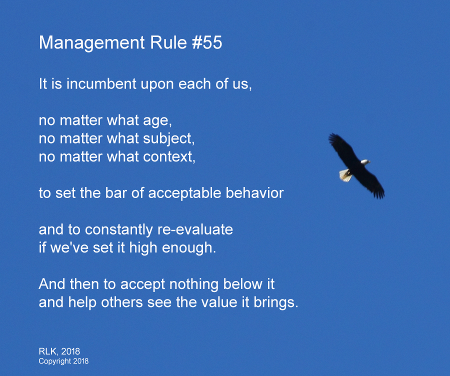 The Team will be the mirror image of its management. If you lie, cheat steal or the like, your Team will be the same way. Want them to trust you? Do you want the Team to be there for those times you need to make a “no look pass”? The you need to understand that the Team will watch where you put the high bar.