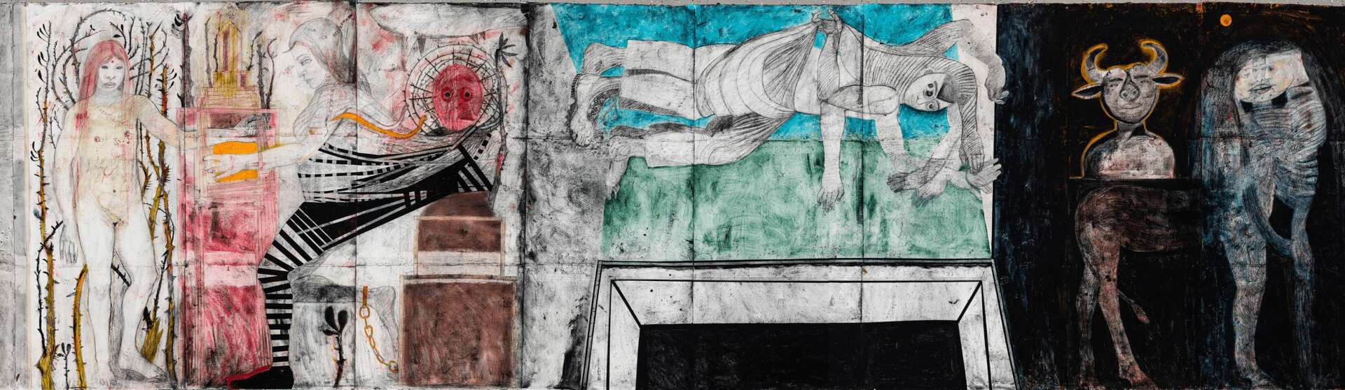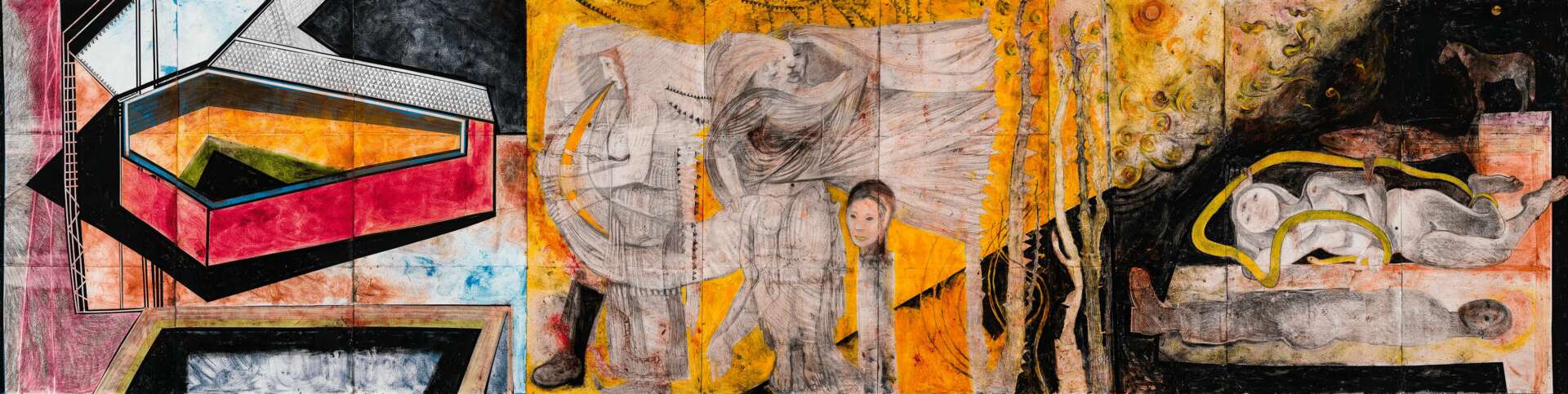 The week I deinstalled the 69 panels from the Orlando Museum of Art, I had a serious accident while riding my horse. My drawing hand was stepped on and de gloved and my right collarbone was broken and required surgery. I continued to draw with my left hand. These panels were included in the show I had at the Baker Museum in Naples Florida .