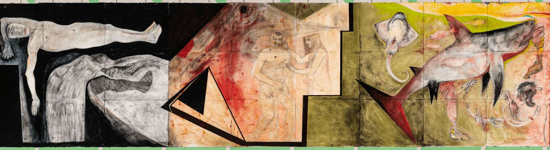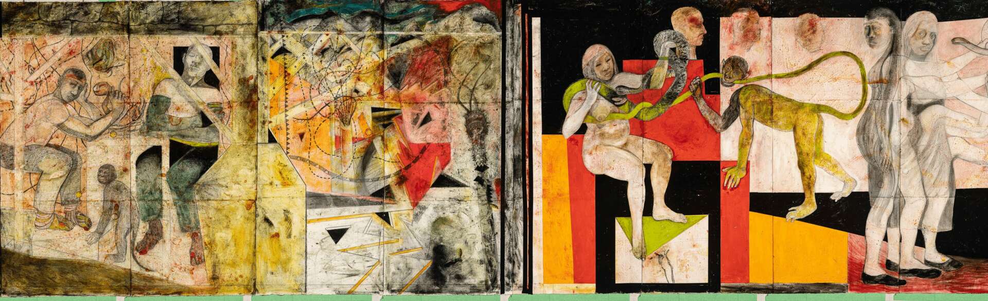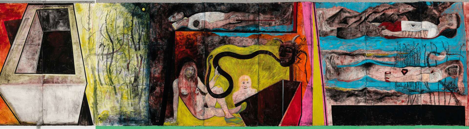 Where The Promised Land paintings are 22” x 30” in size, The Promised Land project is constructed on panels measuring 5.5’ x 2.5’. I started The Promised Land project in December 2018 and as of August 2023 there are 458 panels measuring over 1000’ in length. These panels build on the themes of the smaller Promised Land paintings. Sixty-nine panels were selected for the 2021 Florida Prize in Contemporary Art exhibition at the Orlando Museum of Art, and as a result I was awarded the $20,000 prize. Consequently, sixty-five of the panels were selected to be exhibited at the 2022-2023 Florida Contemporary exhibition at the Baker Museum in Naples, Florida. I have no plan to finish this work: it may be my Watts Tower…