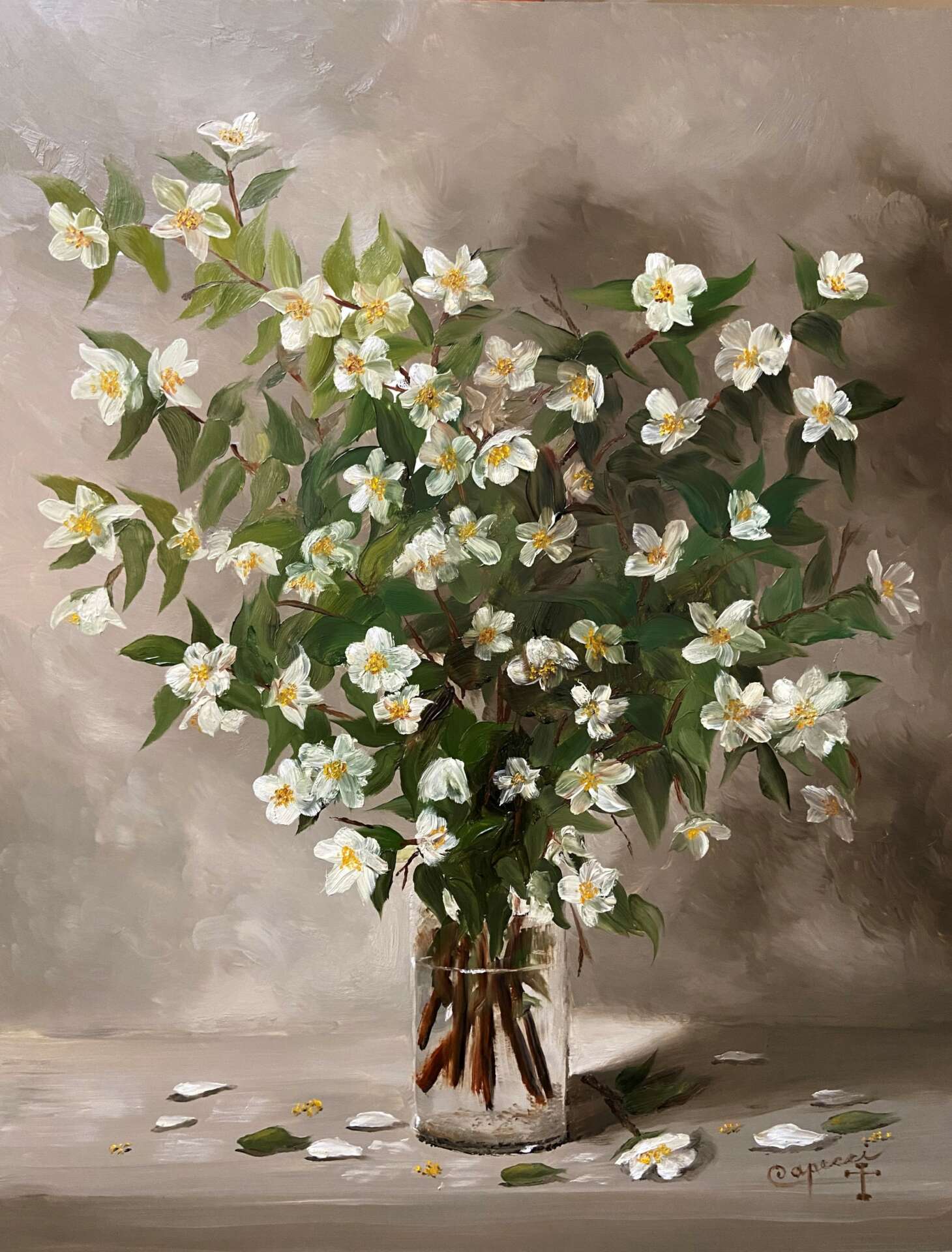 Bringing me up to present day, my dream is to make a living at producing and selling my artwork. During the 8 years that I was represented in the gallery where I eventually worked, I sold many paintings My love is the still life, going back to my roots. There are not many, if any, real, still life painters around. And I was, and am, fortunate to be known by my paintings .and have many followers and collectors. I also love to paint ‘en plein aire’…a french term meaning ‘in the open air’. The painter sets their easel outside looking at a scene they’d like to paint. After editing it in their mind, mixing some colors, they set forth to record the scene before them. My tendency is to paint these paintings entirely, or almost, with a palette knife. They are a very good seller for me. People love the textures.