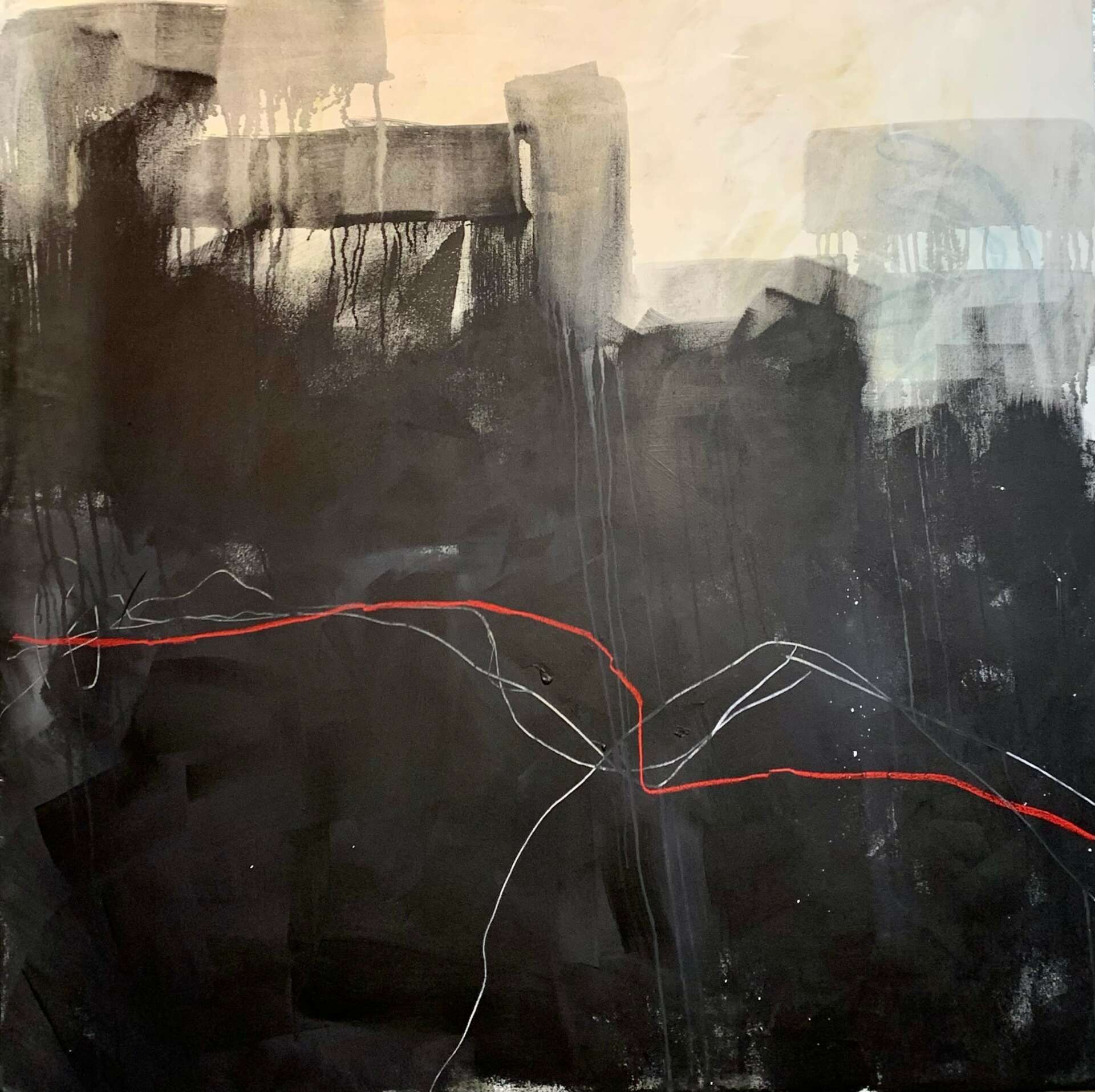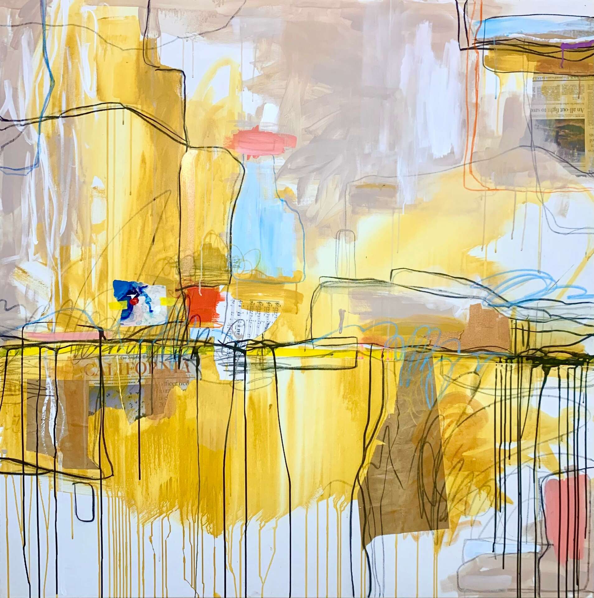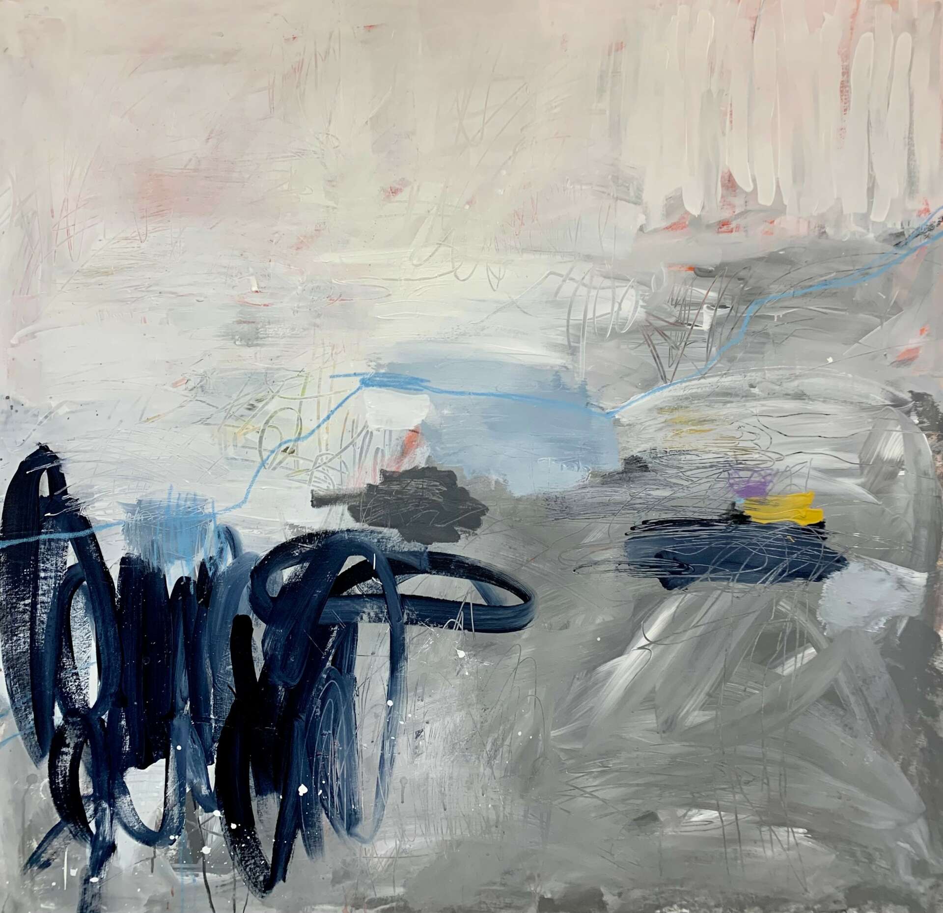 I create to literally rid energy and purge thought, but it’s compulsory to paint on large canvas in a gestural, energized way, as smaller substrates are excruciatingly claustrophobic. I liberally apply opaque and diluted paint, spread it across usually unprimed canvas letting it drip and soak into the cotton. As I add layers of paint and mixed media, I’m keenly aware of my desire to accept the element of chance in how the paint drips and interacts with the materials. I tend to grab mixed media papers almost unconsciously as I answer the painting’s composition and textural needs. I sometimes scratch into the existing layers to expose the underpainting, creating lines and texture. Lastly, mark making becomes an extension of my nervous system, the vigorous scribbles cut into but add to the harmony of the painting, accentuating the visual emotional narrative until I feel complete. At times I experiment with larger paper and cradle board, using mixed media, paint, encaustic and cold wax mediums.