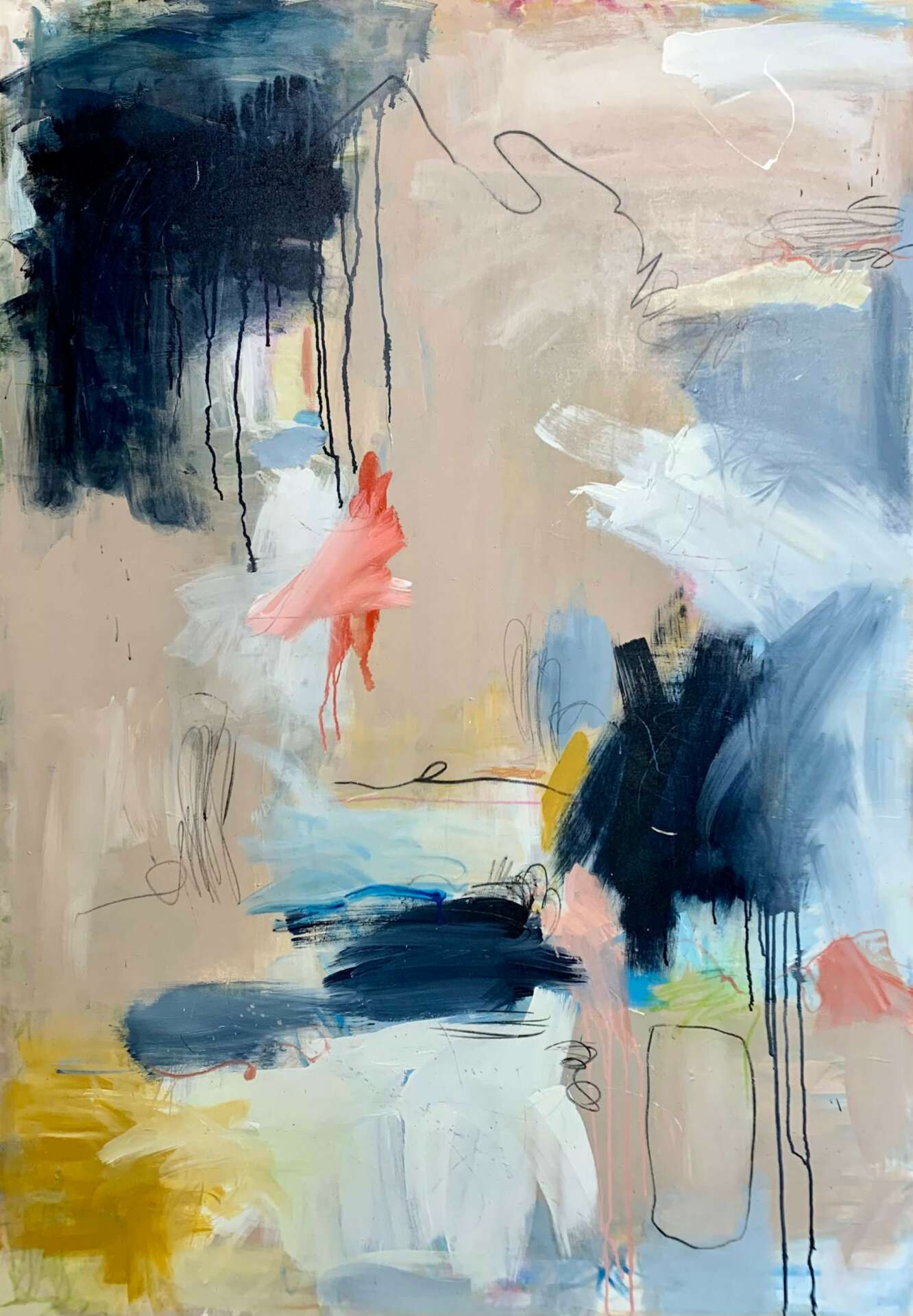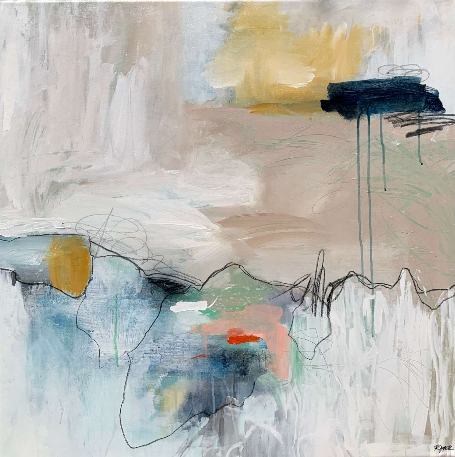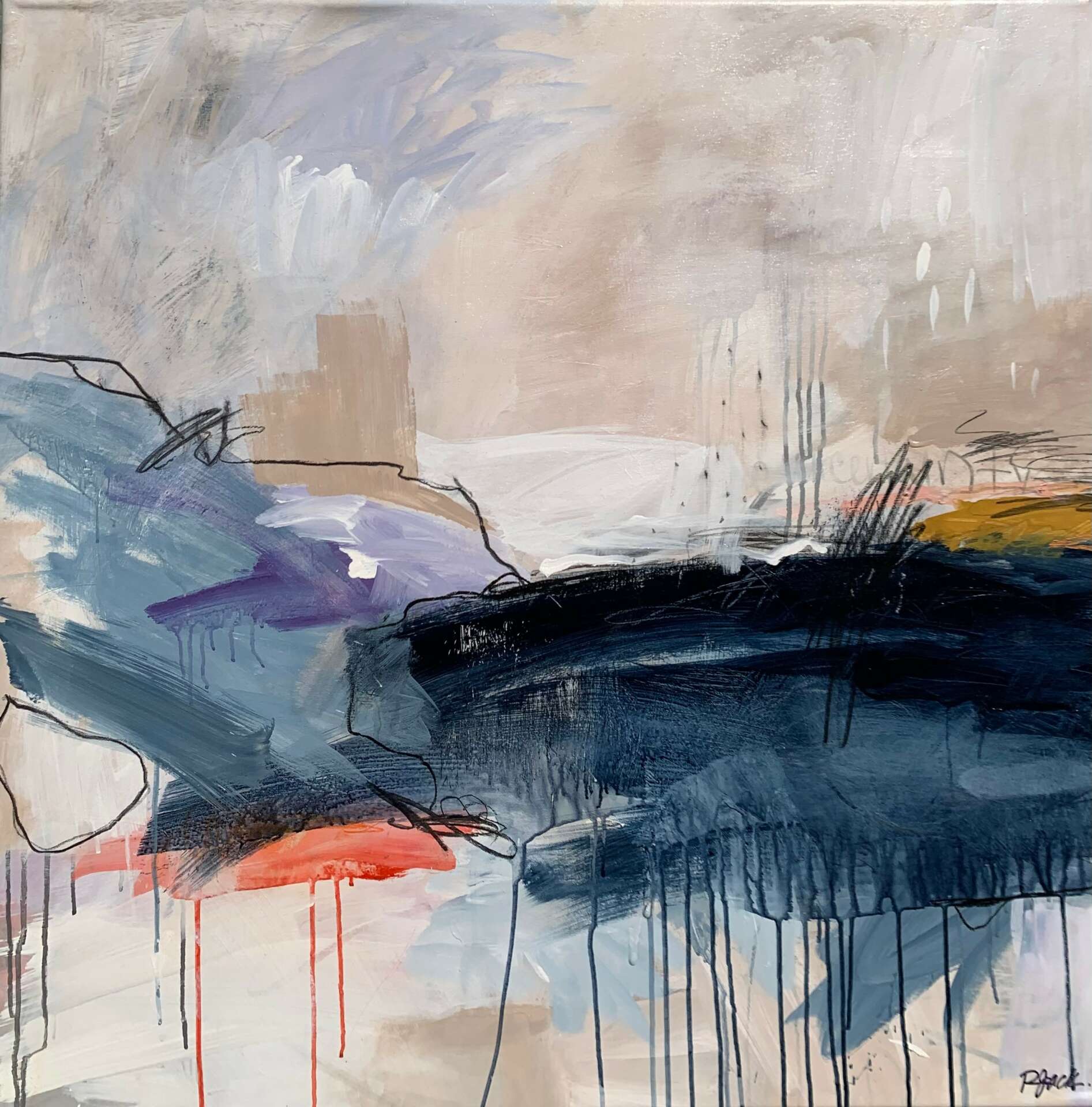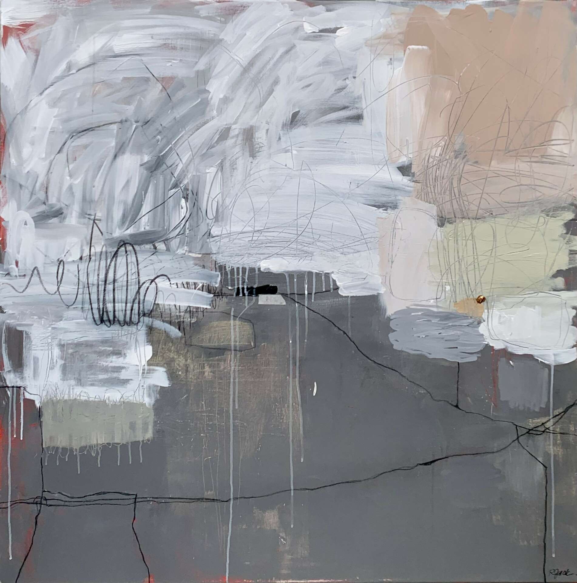 I create to literally rid energy and purge thought, but it’s compulsory to paint on large canvas in a gestural, energized way, as smaller substrates are excruciatingly claustrophobic. I liberally apply opaque and diluted paint, spread it across usually unprimed canvas letting it drip and soak into the cotton. As I add layers of paint and mixed media, I’m keenly aware of my desire to accept the element of chance in how the paint drips and interacts with the materials. I tend to grab mixed media papers almost unconsciously as I answer the painting’s composition and textural needs. I sometimes scratch into the existing layers to expose the underpainting, creating lines and texture. Lastly, mark making becomes an extension of my nervous system, the vigorous scribbles cut into but add to the harmony of the painting, accentuating the visual emotional narrative until I feel complete. At times I experiment with larger paper and cradle board, using mixed media, paint, encaustic and cold wax mediums.