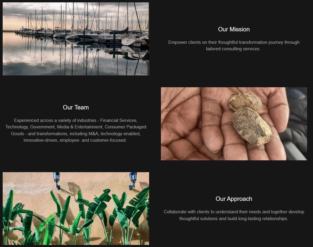 1. Traditional management consulting, where I partner with them to develop and implement thoughtful business, operational and people strategies tailored for their situation. This could include process improvement, organization structure, technology selection, among other services.