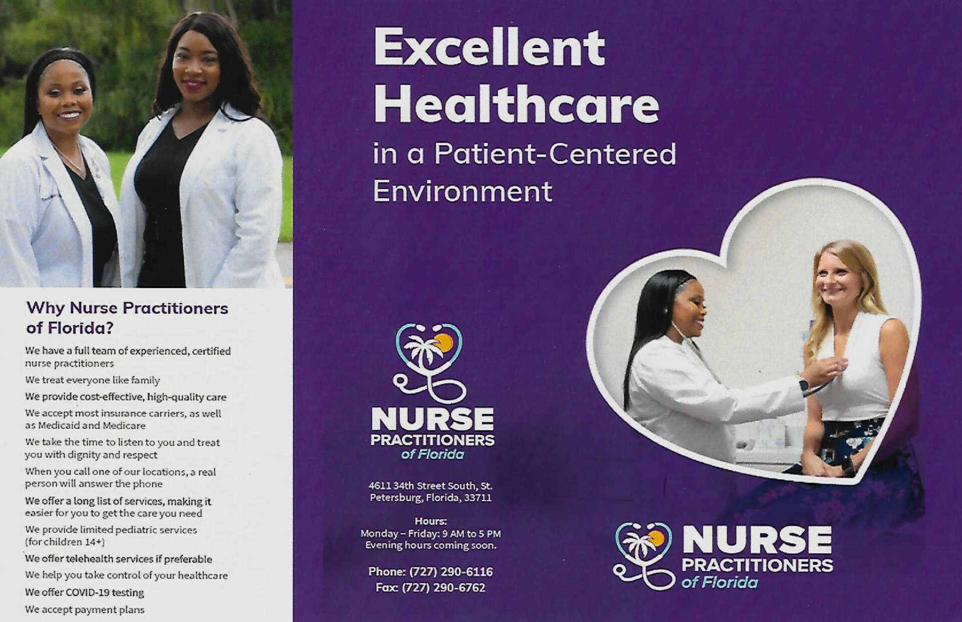 The owner of Nurse Practitioners of Florida Ronsha Brown, not only owns her business in South St. Petersburg but was born and raised here. She is committed to providing excellent care to this community in particular and is proud to call this area her home. Her connection to this community is wide and varied and has been recognized with the Florida Community Service Award as well as recognition from the Black Nurses Rock St. Petersburg Florida chapter for community involvement. Nurse Practitioners of Florida is a small group of women nurse practitioners established July 2018. Our clinic is unique in that it is one of only a few primary care nurse practitioner run offices in St. Petersburg, and the only black woman owned clinic proudly serving the southside community. We are proud to say that in this competitive industry of medical doctors and large hospital owned practices that we have opened a primary care clinic and have been able to keep our doors opens during a global pandemic that began shortly after our inception.