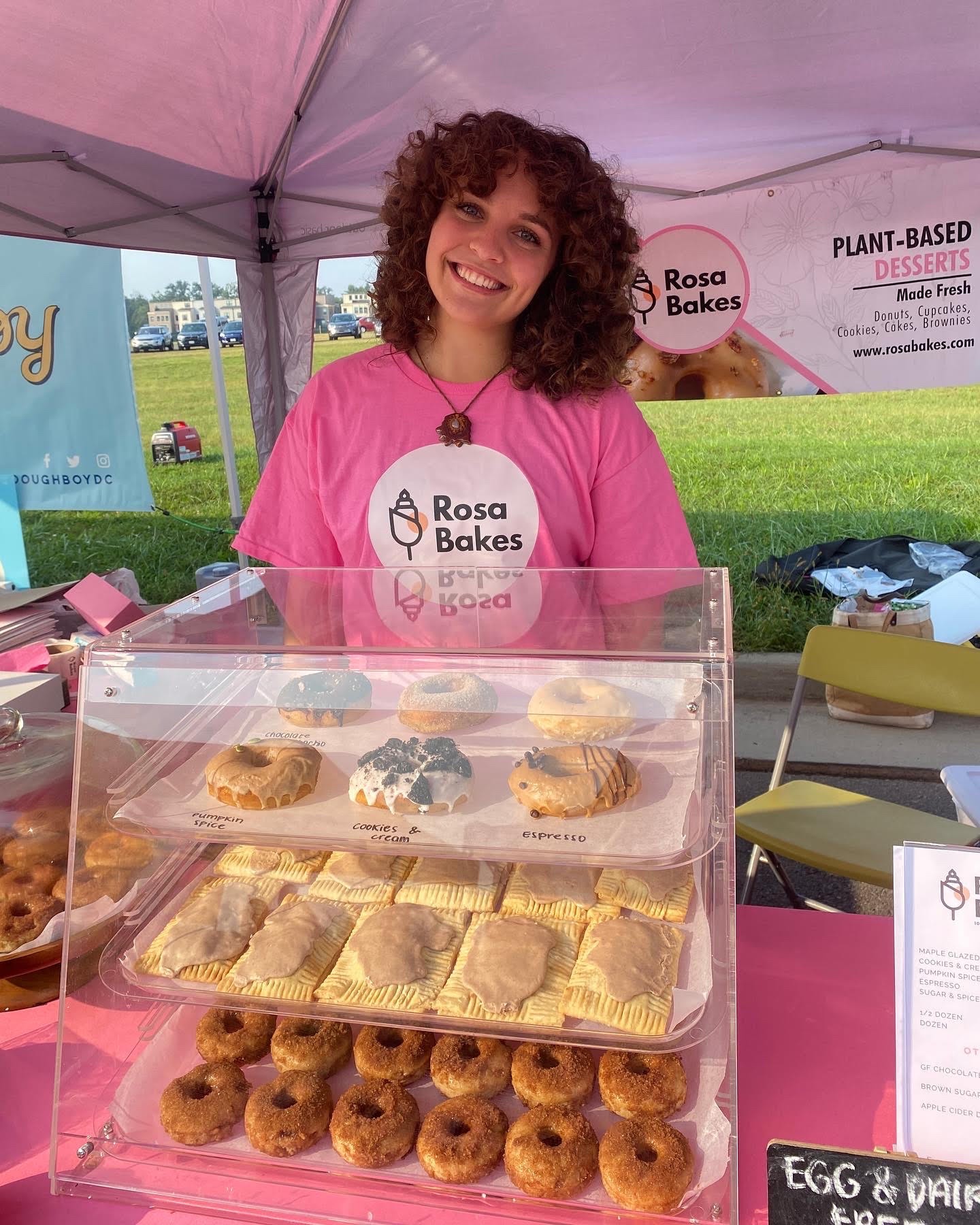 Hello! My name is Rosa LePelch and I’m the CEO/Founder of Rosa Bakes, an 100% plant-based bakery located in Chantilly, Virginia. We currently operate out of a shared commercial kitchen facility, therefore, we don’t have a storefront quite yet! We specialize in gourmet desserts like cakes, cupcakes, cookies, brownies, and donuts. Everything we make is vegan (down to the sprinkles and even food coloring), and we even use organic and non-GMO ingredients.
