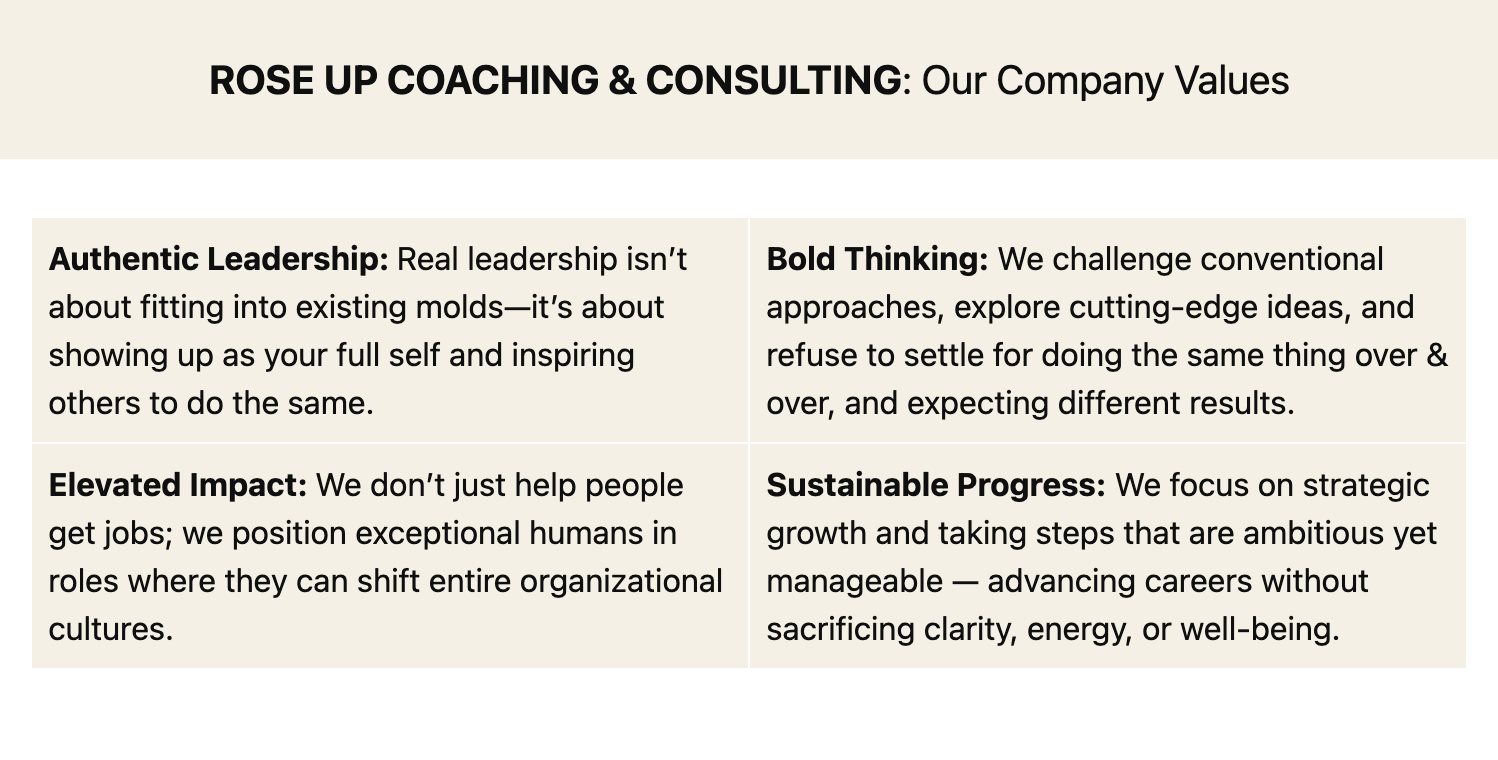 I’m Rose Evelyn, Career Strategist for the job search season and founder of Rose Up Coaching & Consulting (roseupwards.com). My path to coaching began long before I ever called it that. I built my career in advertising and marketing, serving in operations and account leadership and supporting Fortune 500 brands. I was a high-achieving, go-getter and *could* keep up with the fast pace and intense industry — but what fascinated me most was the people: how they grew, led, and often got stuck at moments of change. As part of my role, I met 1:1 with cross-functional VPs and executives — supporting them through people management transitions.