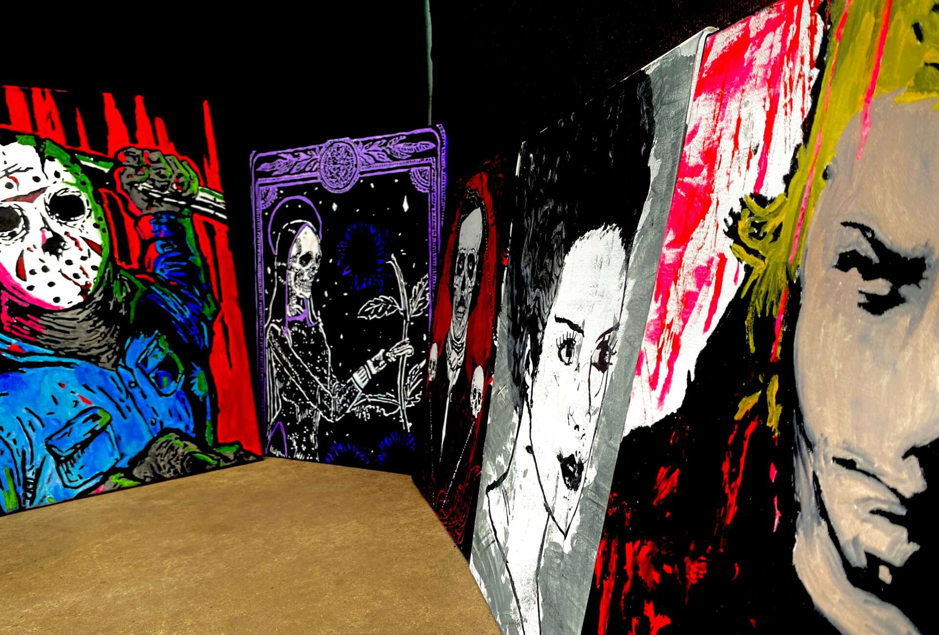 I started painting around 6-7 years ago. I came across an old box with a canvas, bad brushes and dried out paint. While figuring out my next move I painted Pennywise from the film It. It was decent for my first time. What pursued was a love for art and a way to paint anything horror related. Fast forward the pandemic hit and I lost my job. So I needed to figure out a way to make some quick cash and within a few days I created an Instagram account. I started to upload time lapse vids and pictures of all my artwork. I am very appreciative to all those that have purchased my art, and continue to share my work.. Another passion of mine is tee shirt design. I am a huge fan of horror & the occult. So I went ahead and created Koffin Krew Apparel. Koffin krew Apparel focuses more on fashion tee shirts, hoodies, long sleeves, tanks and more. We currently have an online shop & Instagram account. We drop new merch frequently so check out Koffin Krew Apparel on Instagram.’