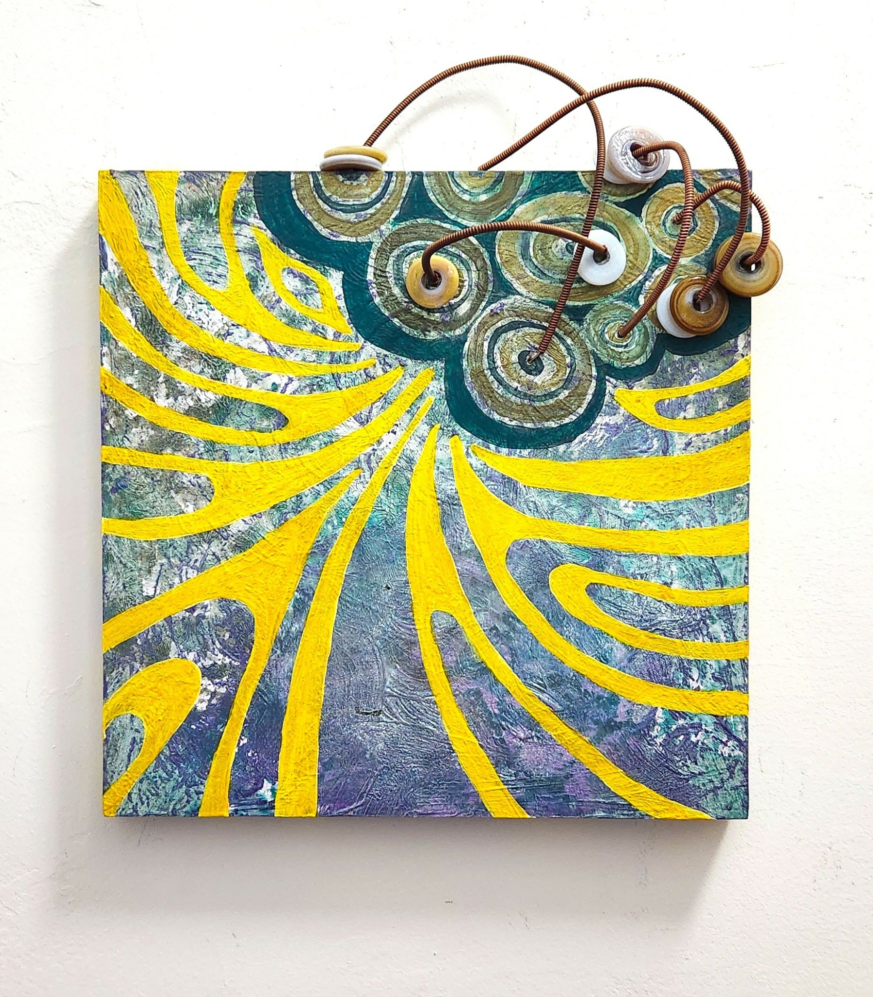 In the past few years, I have been affected by the concept of repurposing, recycling and incorporating found materials. Having collected all kinds of objects, especially beads, from dozens of countries I’ve visited, I often include them in my work. Broken jewelry, beads and even the innards of my piano that I recently disassembled one piece at a time have become additions. After recently acquiring a supply of square panels and not being accustomed to working in a square or even rectangular format, I have been using these additional elements and materials, to break out of the box.