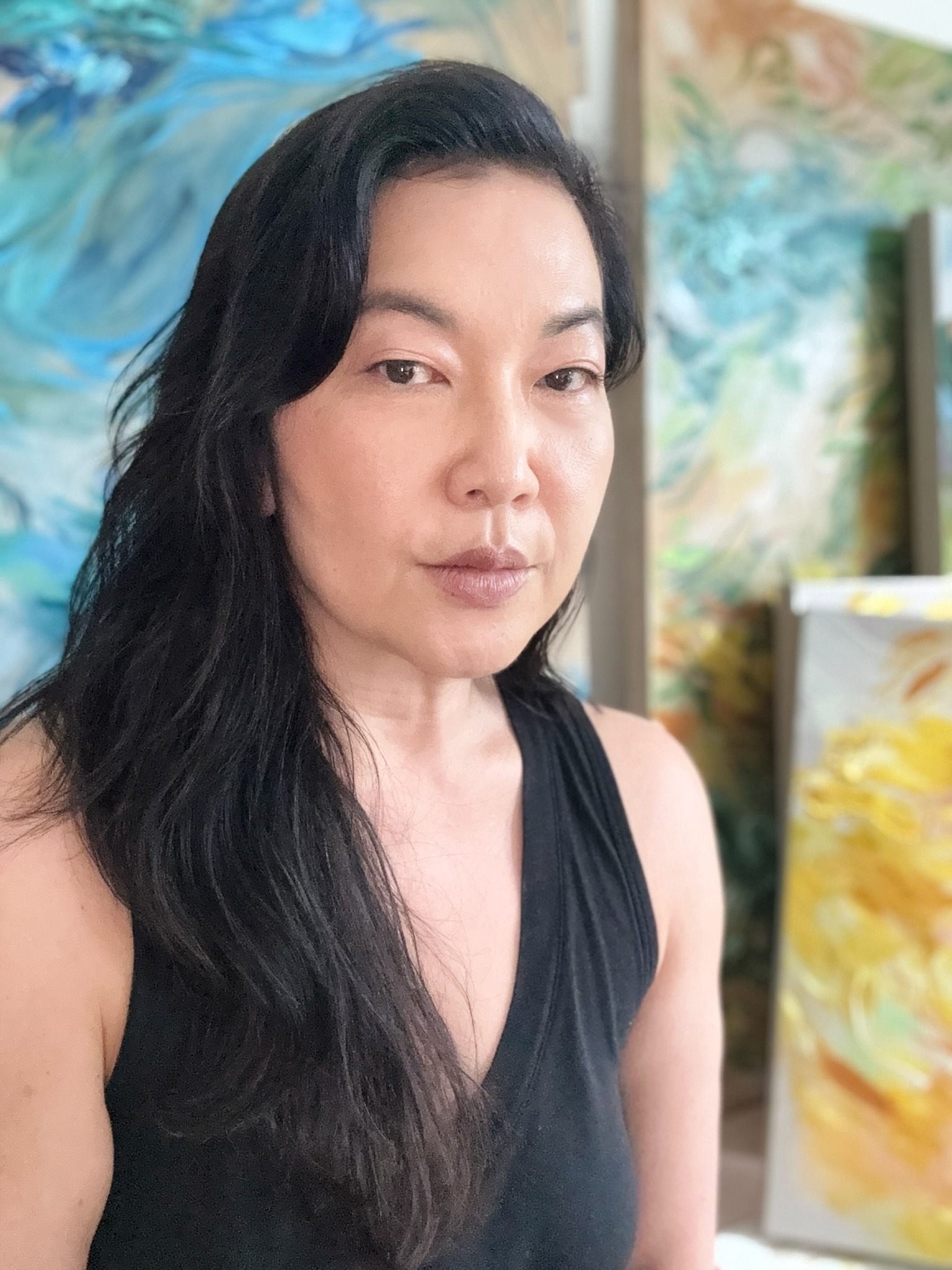 After graduating Parsons School of Design with a BFA, I was hired to do portraiture in my senior year for various projects. It gave me a bit of confidence that I could keep going with art. For steady income, I entered the internet design industry. The dot com companies were just taking off and I started working on graphic design projects there. I did freelance illustration as well. My real love still remained painting and drawing so I kept that up on my off hours. I had my day job and continued to work on my art on the side. This continued for many years until we discovered that our son had autism. I then took a career break to focus on his therapy and school. Though I didn’t know it then, this was formative for me creatively in many ways- it toughened me up to rejection (which is a normal part of the art journey), to keep thinking from many angles on a problem, and to learn to not sweat the small stuff. Advocacy is a muscle that was hard to build up, but it’s a muscle that I benefit from in other areas of my life. After my son got older, I returned to painting so that I could keep more personal hours to continue to care for my son while returning to my original love for painting. In going through all the years of advocacy, I feel I can provide a more attuned communication with my collectors, commissions, and other projects. Doing my best work and providing a great experience are my goals in any collaborative work.