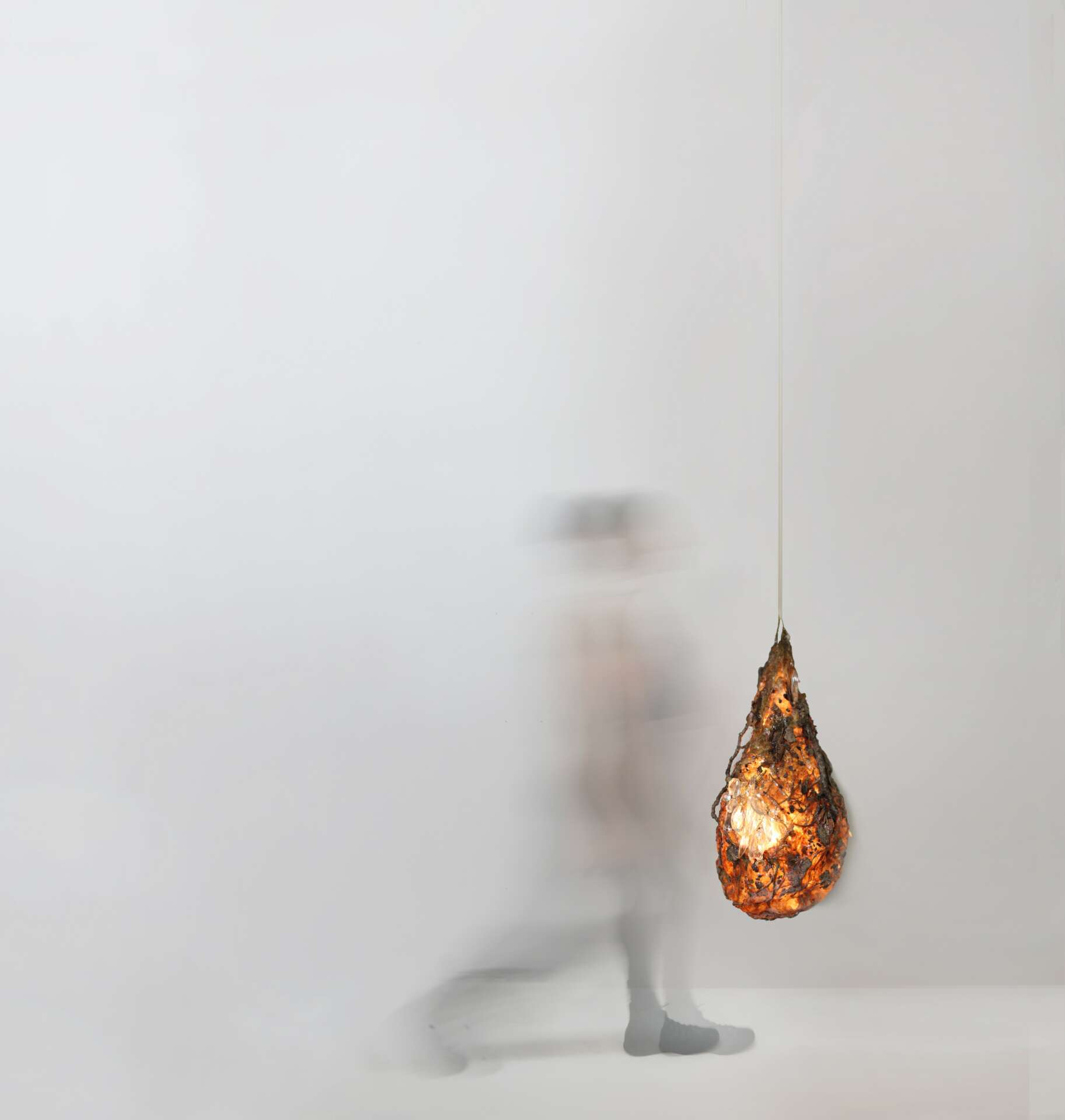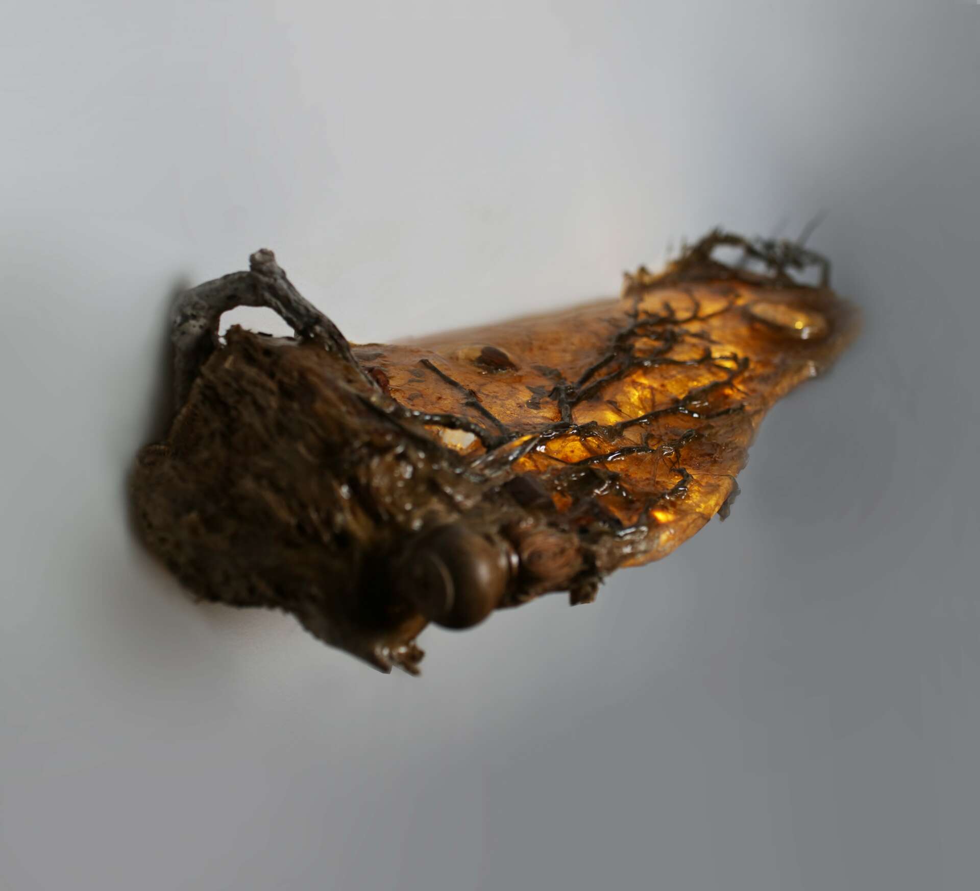 In this Series called “Sympoiesis” I combine protein-based bioplastic with copper, crystals, furniture fragments, flower petals, motion sensors and LED technology.