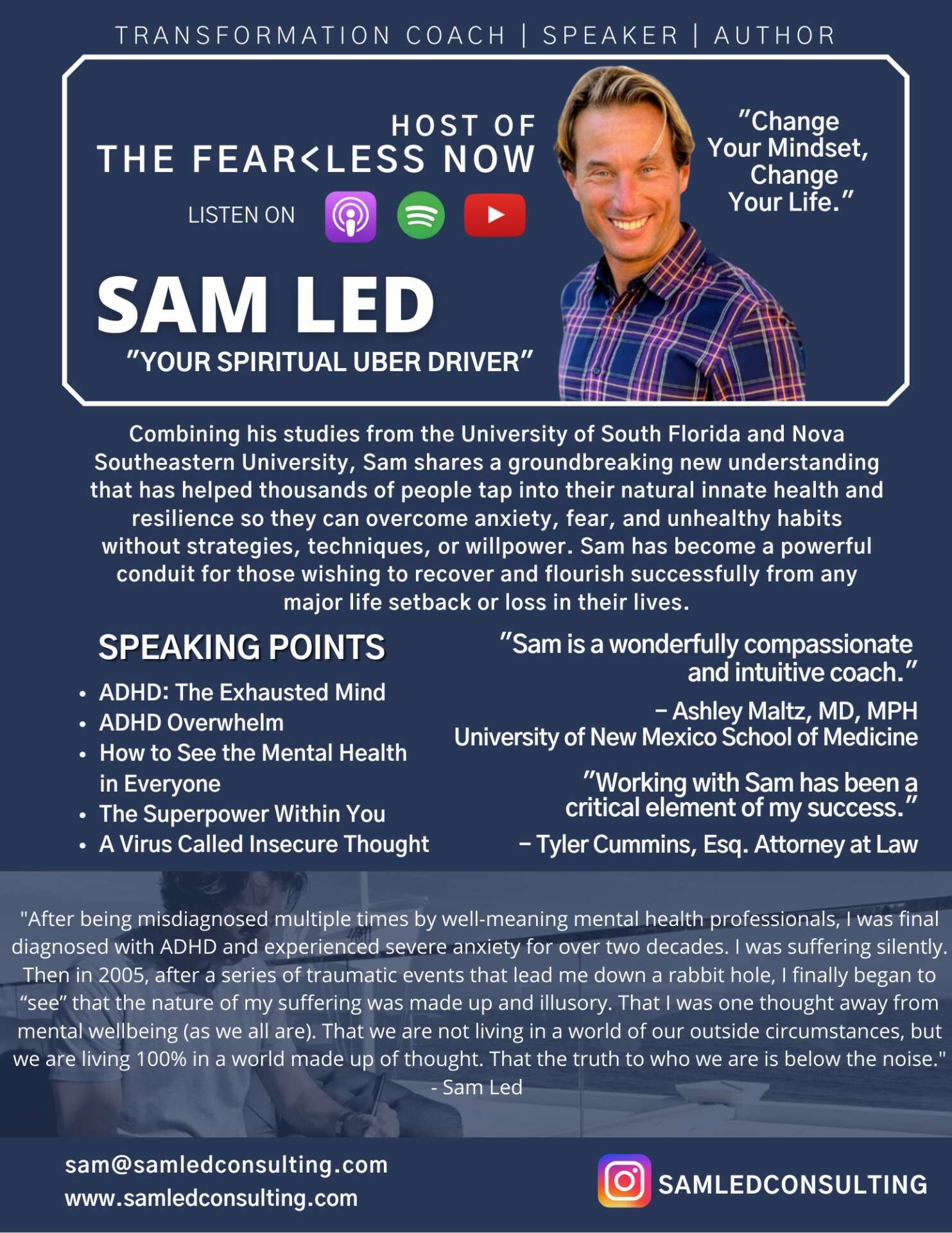 I am a no-nonsense transformation coach, speaker, thought catalyst, creator of the mental health podcast, “The Fearless Now,” and author of the book, “Beyond ADHD.” I share a revolutionary new approach to ADHD and mental health with my clients and explore what is possible when we take our mind and thinking less seriously and discover our innate intelligence and wisdom underneath the daily dose of noise in an ADHD mind. I works with clients all over the world via Zoom and lead one-on-one personalized coaching sessions and online group programs about understanding the ADHD mind and neurodiversity. I use my years of experience and deep knowledge of personal development, human behavior, spirituality, and natural intuitive gifts to gently guide my clients look underneath the heaviness of their noise called thinking to find true insight and wisdom on what to do next in any situation.