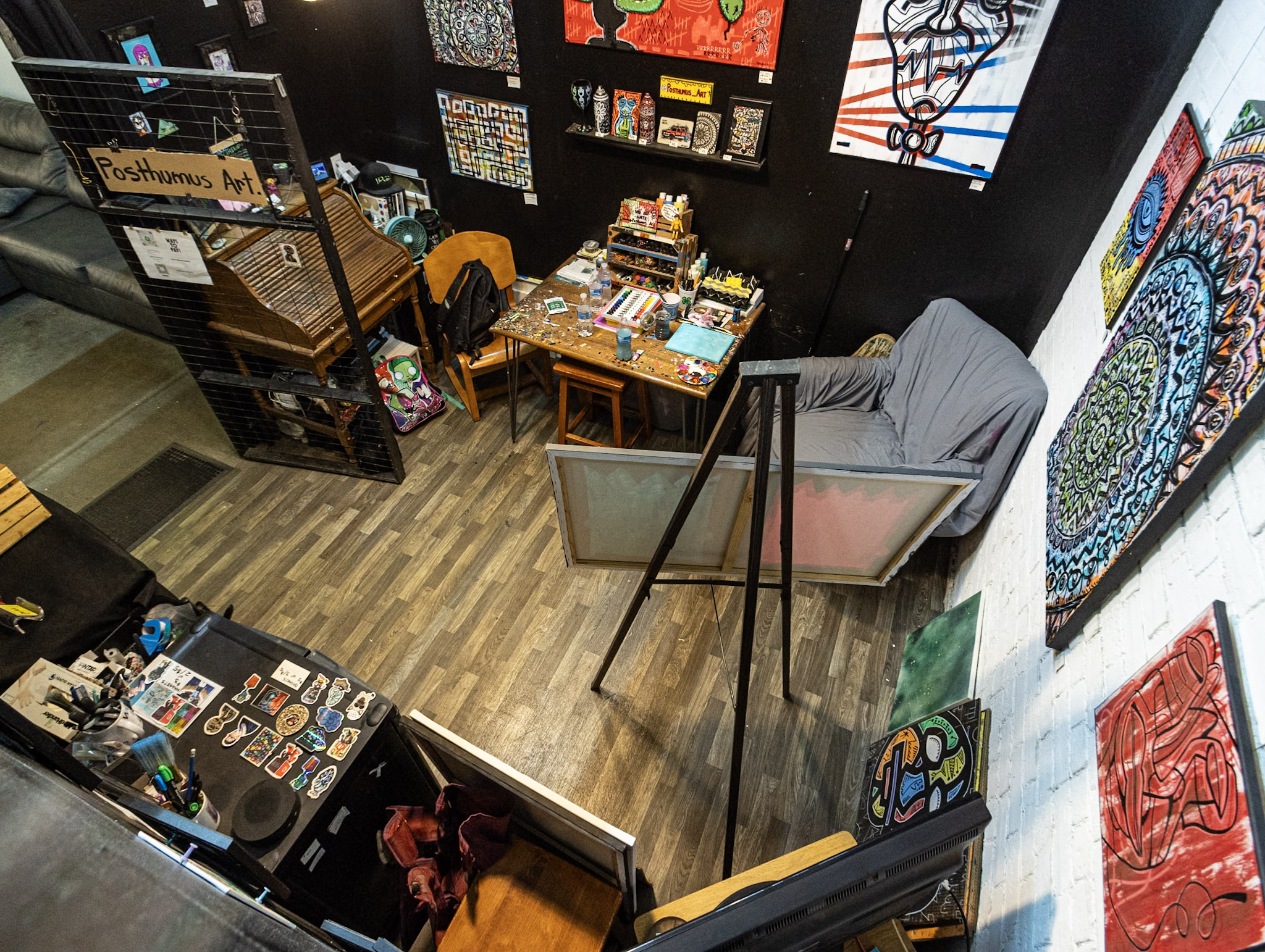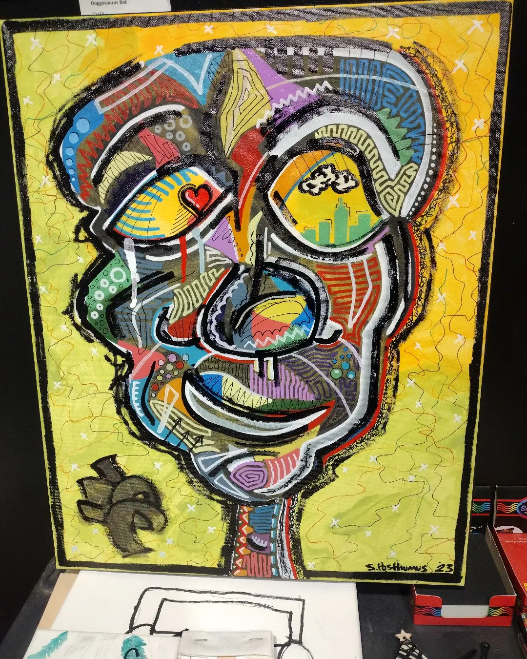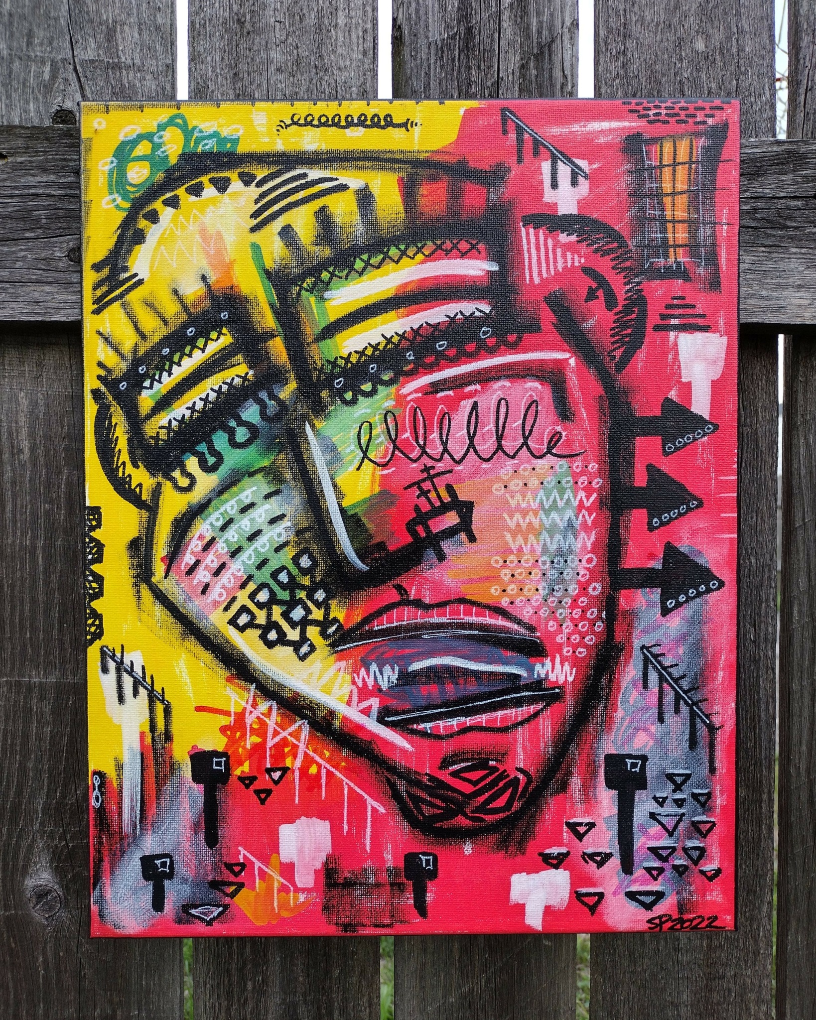 My name is Sam Posthumus a.k.a. Posthumus Art. I am a visual artist from the midwest U.S. currently residing in Indianapolis. My visual artist journey started about ten years ago when I started painting custom shoes. I moved away from shoes to be able to create more of my own ideas and works. My work is very heavily influenced by my surroundings and the people I encounter in my daily life as well as my perspective on these things. I mostly use acrylics, paint markers, and spray paint to create but I do venture outside of those ‘comfort’ mediums from time to time. Stylistically I would say my art is a combination of street art and endlessly doodling in a sketch book. Bold colors and line work have always been a personal favorite and it features heavily in my pieces.