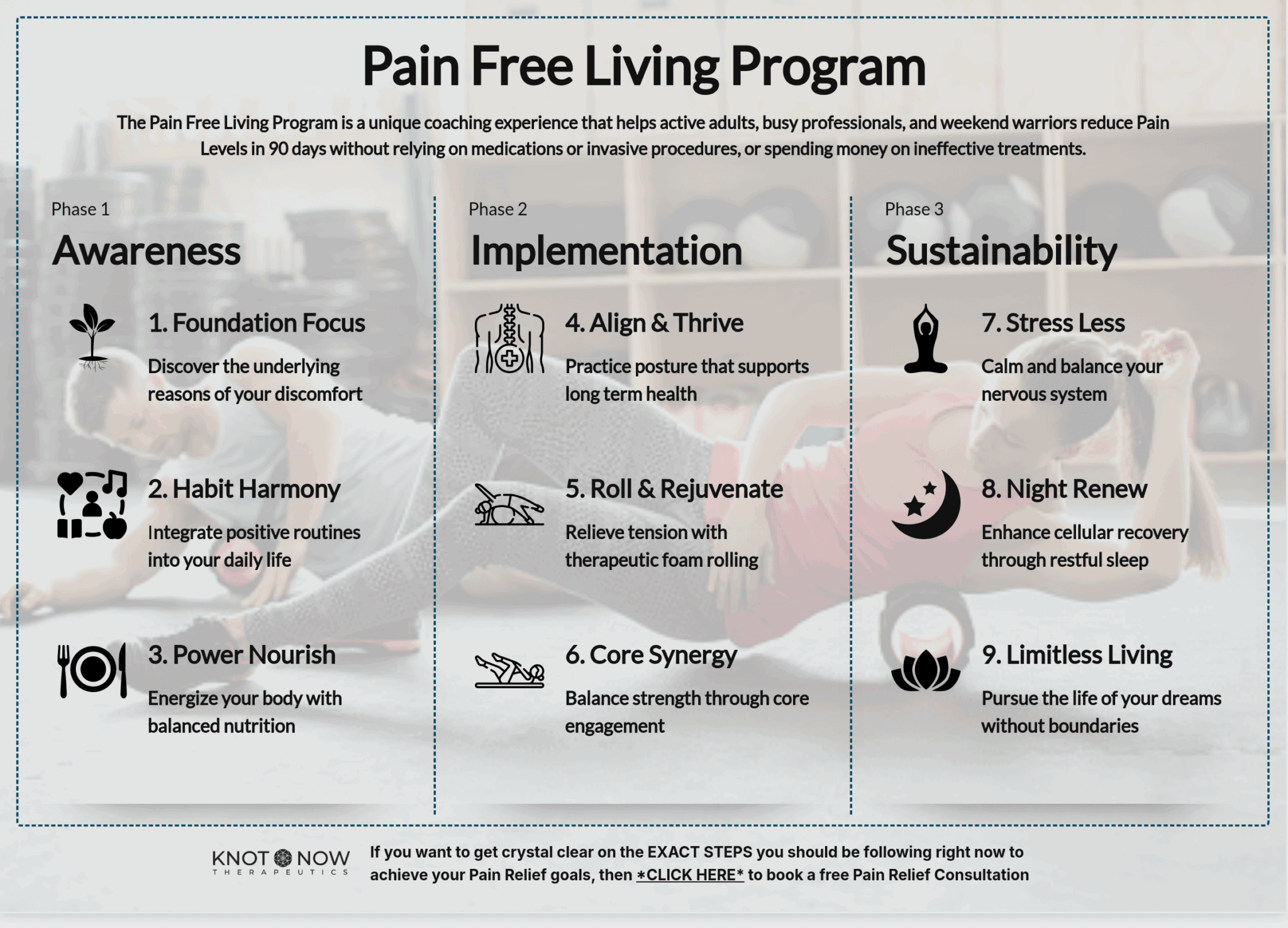 I’m the founder of Knot Now Therapeutics, and I help active adults who are sick of chronic pain and tired of getting the runaround from traditional medicine. I specialize in teaching people how to actually fix their own bodies—using a combo of self-massage, movement, and education that puts them back in charge of their health.