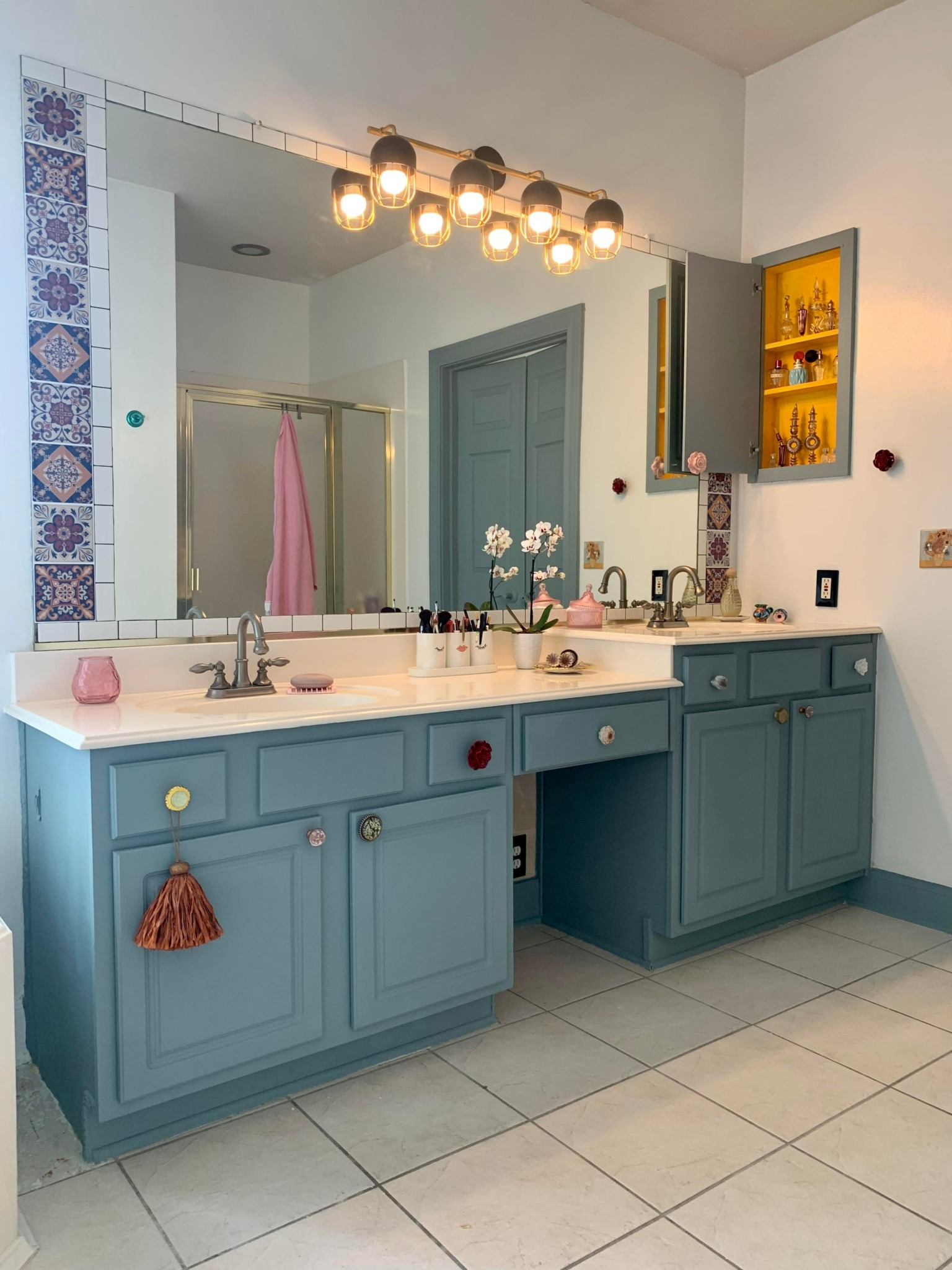 The most meaningful project I have ever worked on was Rima’s Kitchen Cabinets. Rima is a dear friend who I met through my husband’s boss. She has such a wonderful sense of style and a loving personality. Rima had me paint her stair rails a beautiful color we custom mixed and she has leopard print stairs! Her house is full of color and unique decor. We spoke about some other areas in her home we could refresh with pretty paint colors and the kitchen came up. Rima wanted to paint her cabinets pink! I was so excited and honored to create the kitchen of her dreams. Each day I would show up to work she would make me tea and breakfast. She would bring me snacks and juice using pretty dishes and cups. We always had the best conversations and her daughter-in-law Mary would join us. They both made me feel so loved and like I was family. We had such a great time seeing the project through and choosing fun hardware for the pulls and knobs. We finished with a photoshoot; this was the most enjoyable, bold, and rewarding project I’ve ever done. It filled my cup in many ways. I will always be grateful.