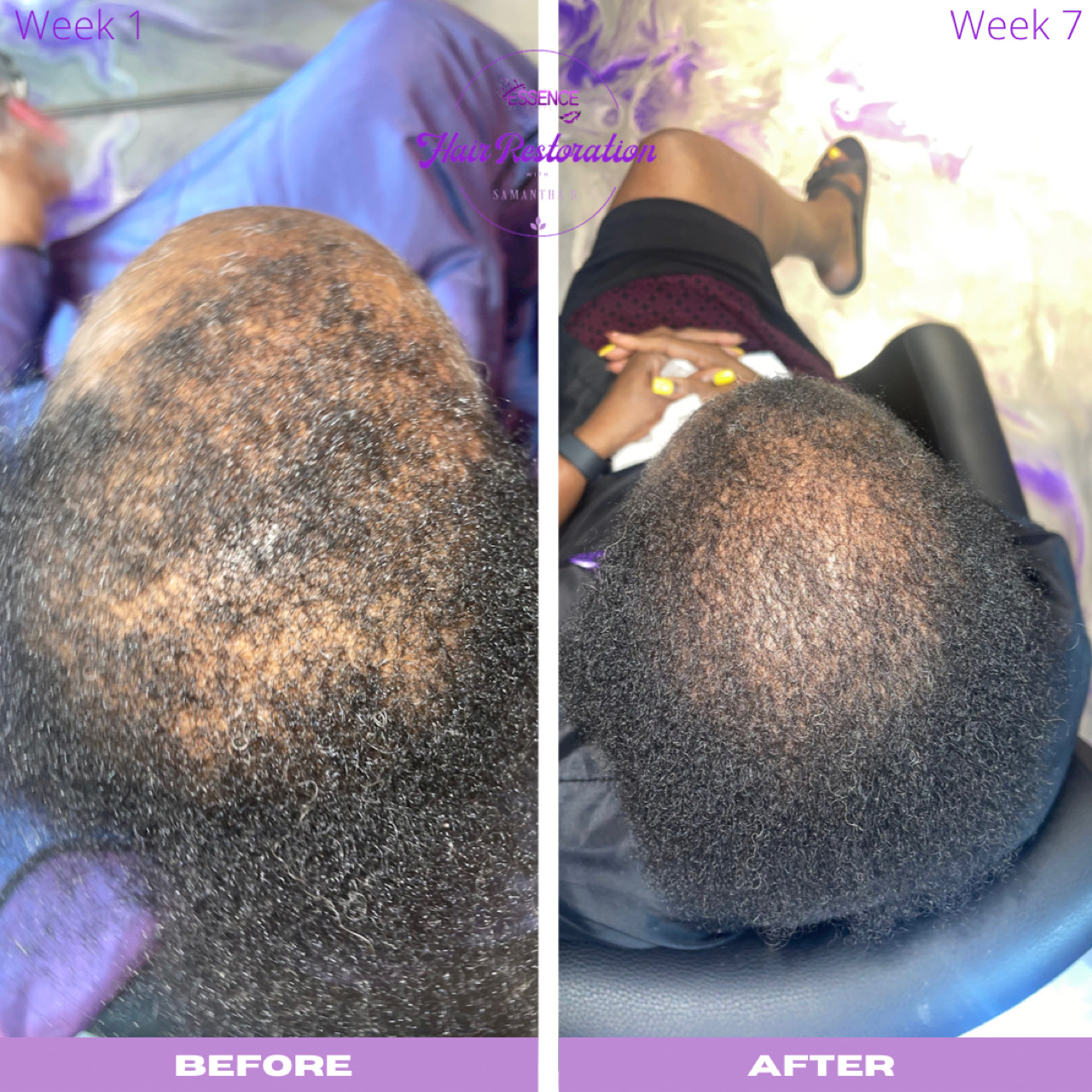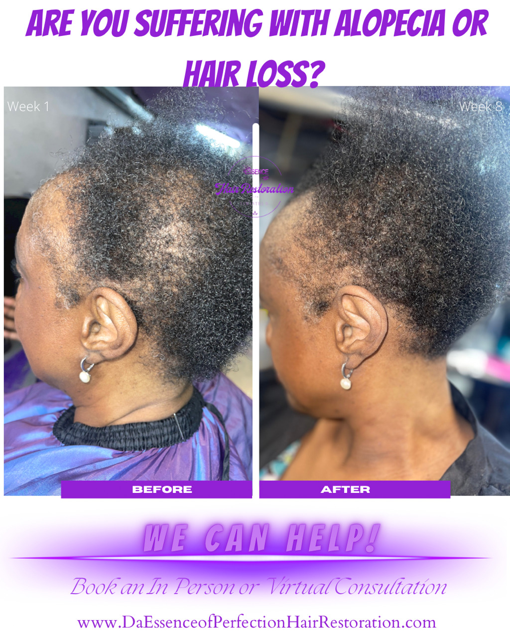 DaEssence of Perfection Hair Restoration was created to help women, men & children grow their natural hair back along with their confidence. I declare that all hair loss is not permanent. I have learned a multi-therapeutic & holistic way to substantially grow a person’s natural hair back from the root with my 12-week treatment plan.
