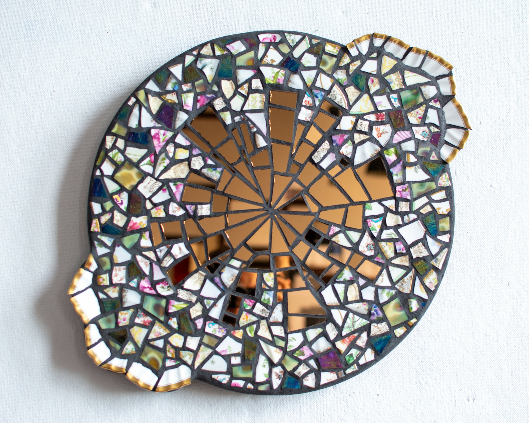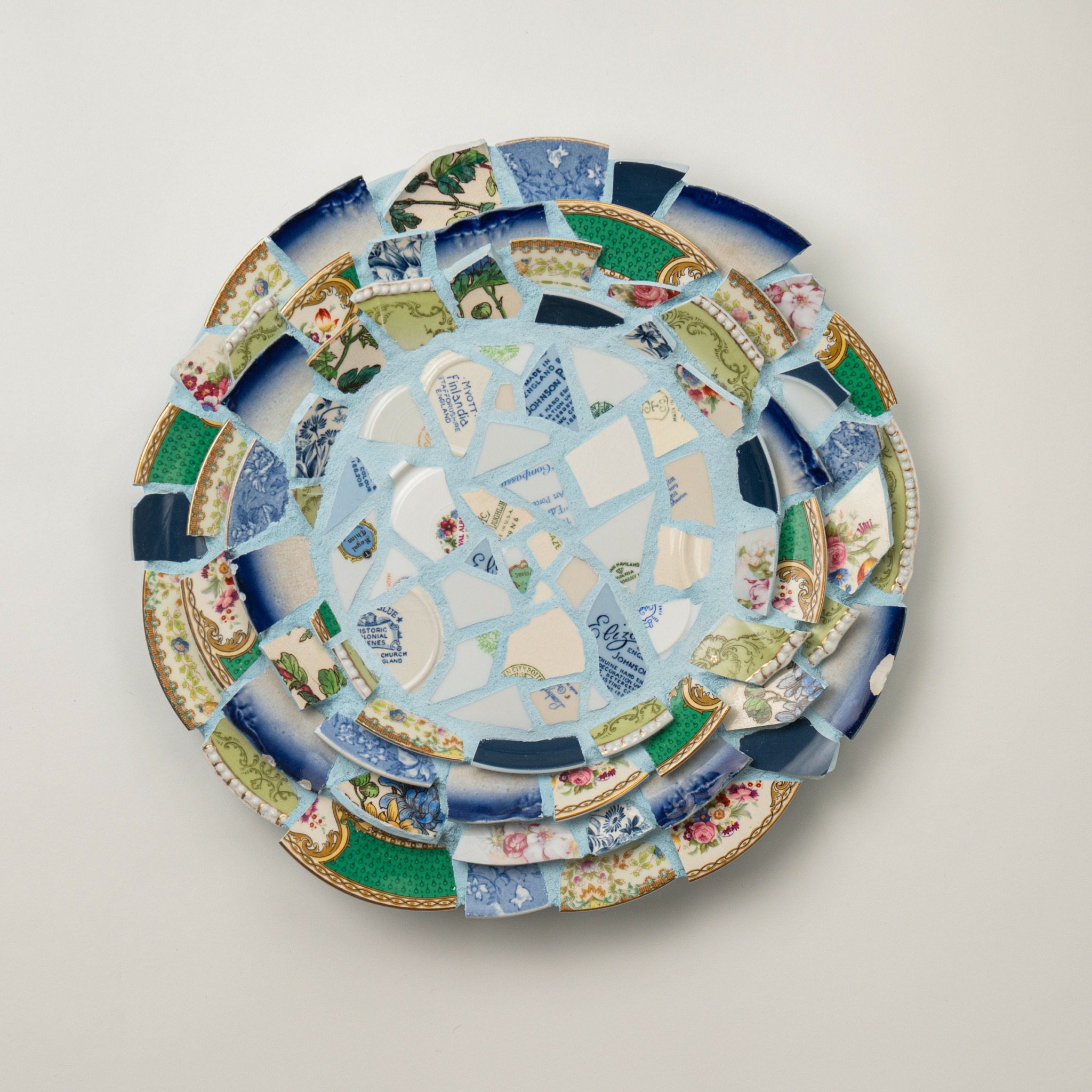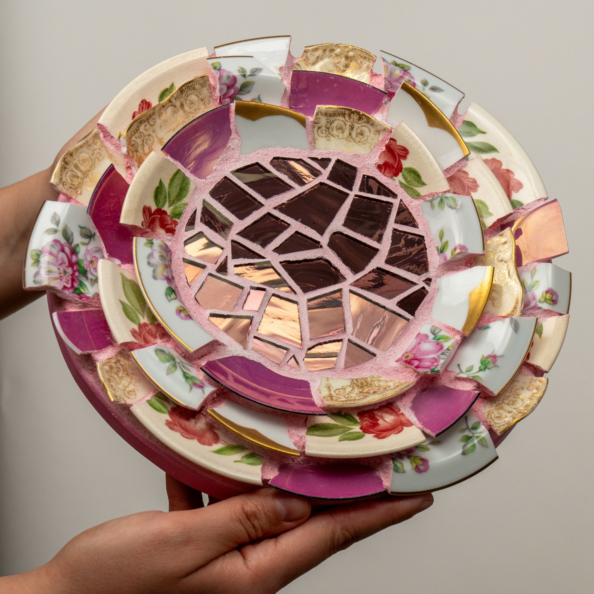 The mission statement that drives my work is an exploration of the ways in which feeling broken can transform us, as well as the things we can do to transform ourselves through that healing process. Since creating my first mosaic in this style in 2015, I have been on this journey of thinking about these pieces as a vehicle for healing. I realized that when a plate breaks in the home it acts like an alarm. This accidental moment of destruction needs to be remedied and the evidence must be swept up and discarded. Such a response indicates something shameful occurred. We are not taught how to handle plate shards after a plate is no longer whole, we are taught to make the evidence of fracturing disappear. If we think of ourselves as plates, fractured by life experiences, what happens after we are broken? Can we hold the delicate shards created by our trauma with tenderness, can we create healing for ourselves?