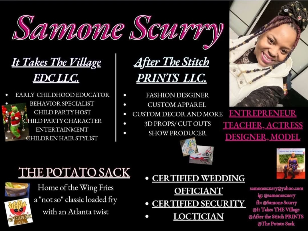 I am Samone Scurry, Jack of all trades. I am a Mother, Early Childhood Educator, Entrepreneur, Actress, Designer, Model, Caterer, Loctian, Wedding Officant, and Security to name a few! I have been blessed with many skills and believe in being a service to my community with all I have been given.