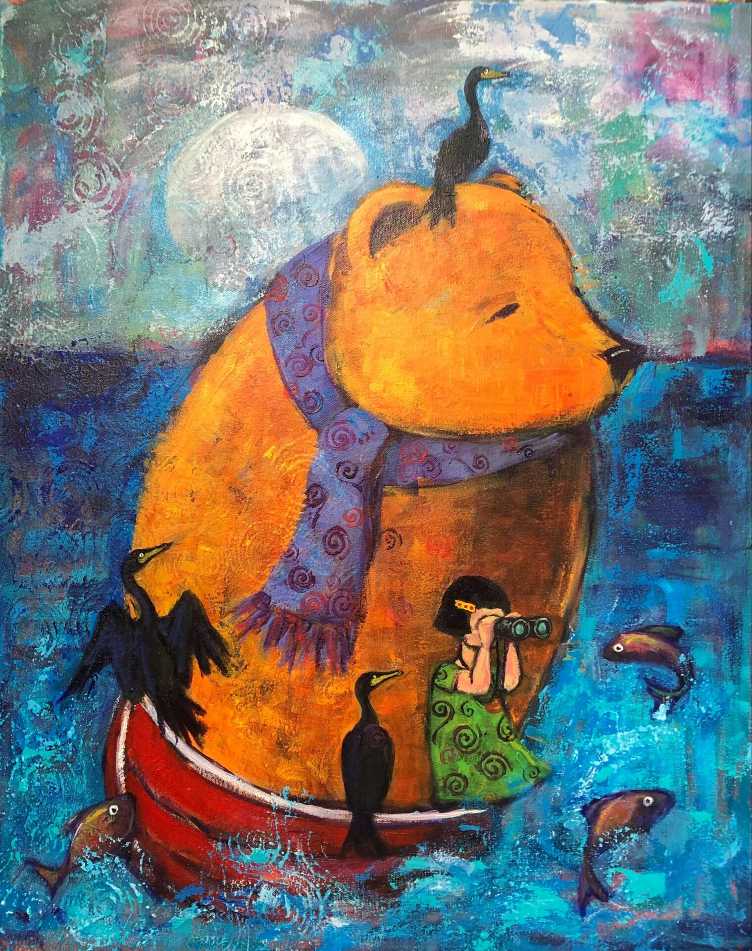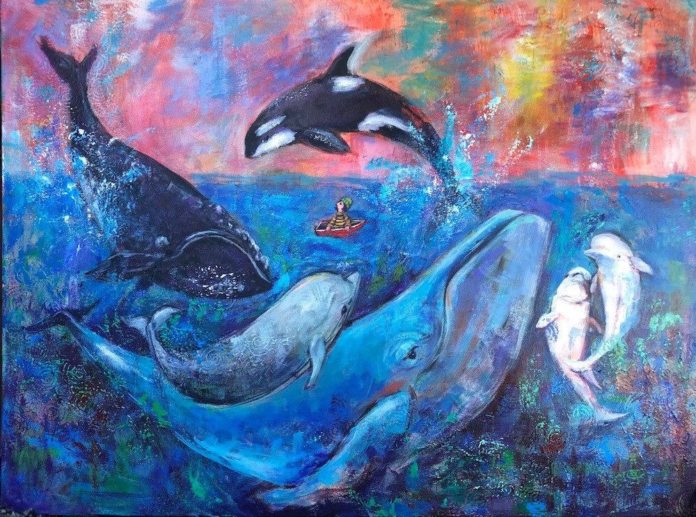 I have been working professionally as an artist/painter for about 30 years. Im a graduate from the Ontario College of Art and Design in Toronto Ontario, Canada where I majored in editorial illustration. I did some illustration work but found over time that I loved painting large scale so my illustrations grew into paintings. I credit my illustration education to the figurative, storytelling, imaginative aspect of my work. I tend to focus on the lighter and sometimes quirkier side of life in my paintings and in doing so hope to bring a smile to the viewer and perhaps a moment of feel good recognition. This makes me proud, but I’m also very proud that I’ve been able to give financially through my art. I’ve held a few fundraisers, the first following the devastating fires in Australia. My husband and I were at the tail end of a three month camping trip in Australia when the fires began, so on my return home I painted a series of three paintings which I made in to reproductions and sold, donating 100% of the commissions in support of the Australian wildlife. And more recently I held a similar fundraiser in support of the war in Ukraine.