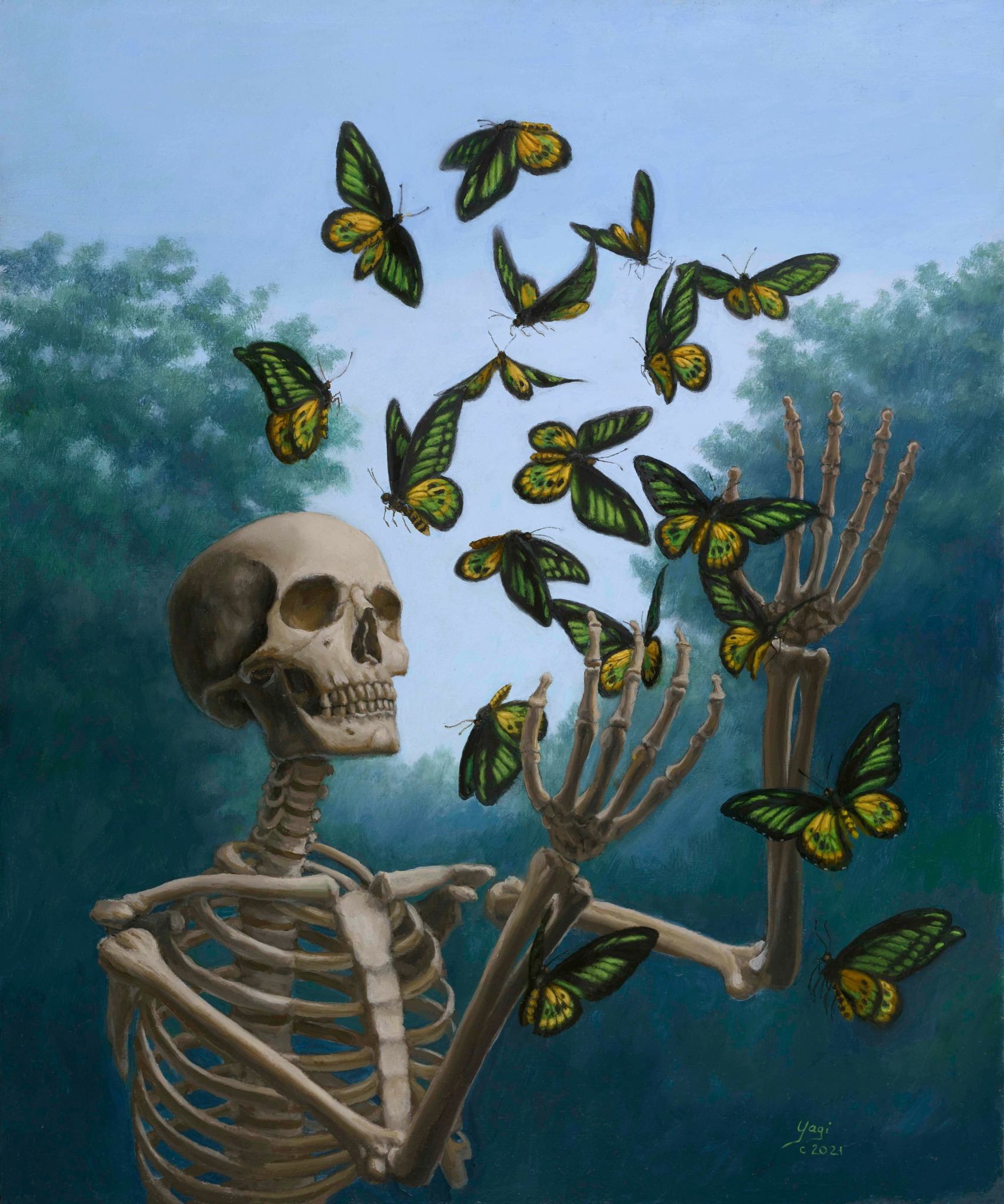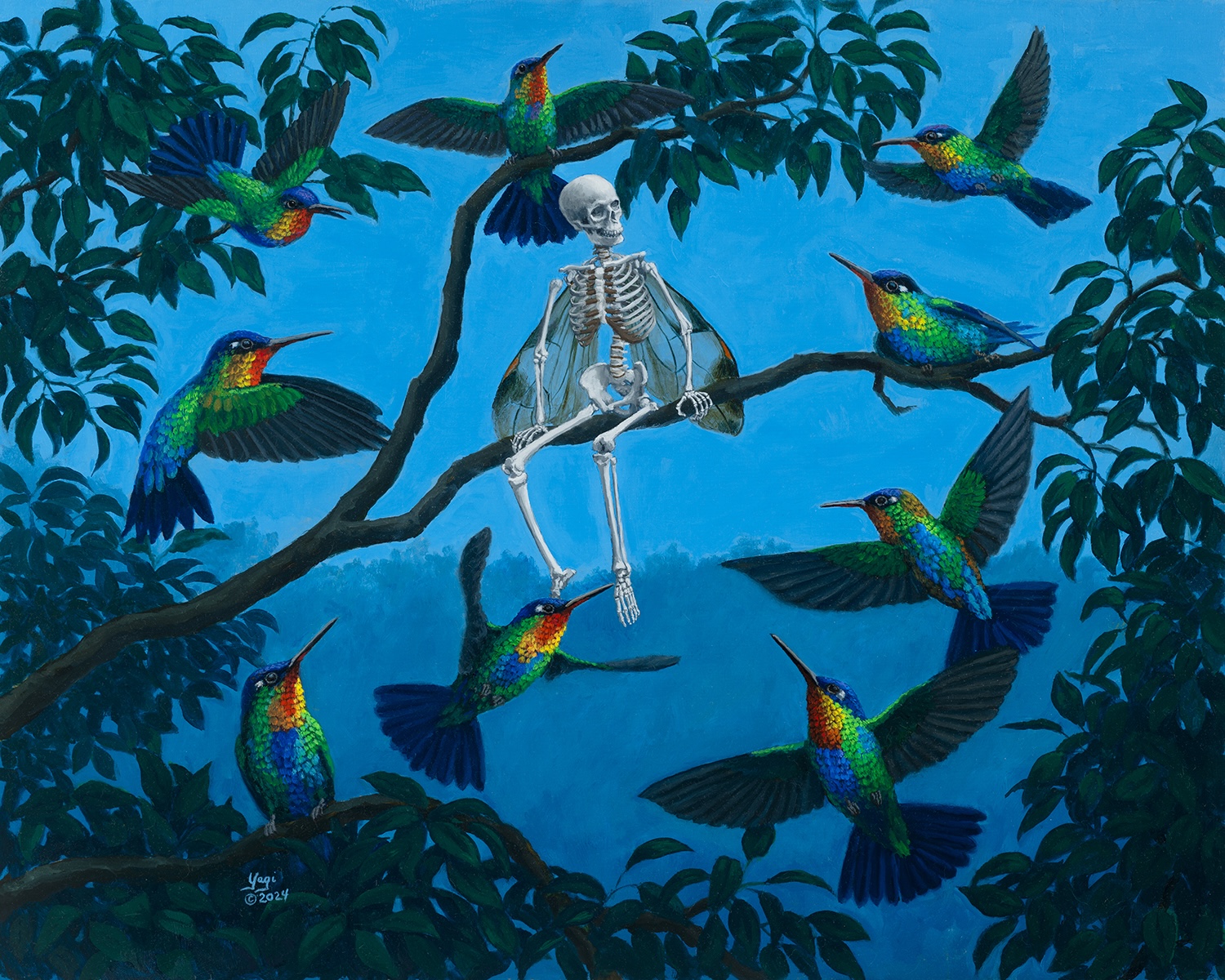 Being an artist has been very fulfilling. I have numerous collectors who enjoy the imagery and meaning in my oil and watercolor paintings. While I occasionally do commissions, I am grateful that I can paint what I believe in and on my own terms. My art often explores the subject of mortality, an area that many people try to avoid thinking about. I use the skeleton as a symbol of mortality, and also use it as a representation of human impact on the environment. I incorporate vivid colors of nature into my work, so that it can convey messages about a serious subject while providing beauty for the eye. I thoroughly enjoy contemporary art, such as Takashi Murakami and William Kentridge. Much of my inspiration comes from looking at the work of old masters.