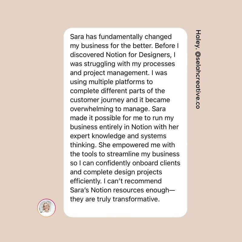In March 2022, Notion invited me to go through the Certified Notion Consultant program — submit case studies, take an exam — and in turn I became the 10th Certified Notion Consultant in the United States. I shut my design business down and relaunched as a digital operations agency. It was the best decision I’ve ever made for my own career and the health of my business.