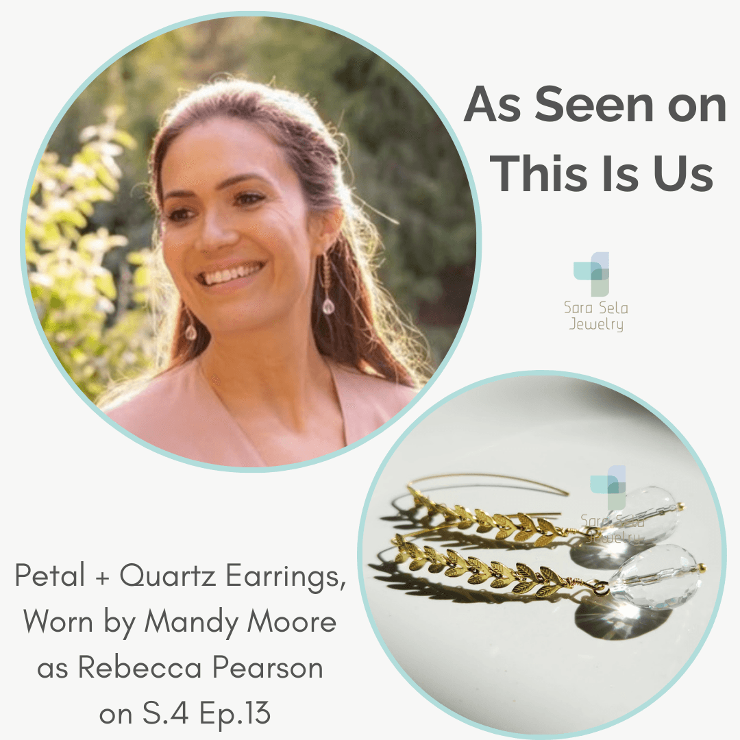 Fast forward months later and we were offered to gift our work to the costume designer for This Is Us and I think I almost swooned lol. I chose 2 pieces to send, my Petal and Quartz Earrings and a dainty gemstone necklace. Now we are told from the beginning that we won’t necessarily know if they will use our pieces and patience is very important, so when in December of 2019 while I was putting my newborn daughter to bed, and a fellow member of The Artisan Group saw Mandy Moore wearing MY earrings in her IG stories, I totally freaked out! I knew that meant I would be seeing my Petal and Quartz Earrings at some point on the show. It took almost 2 more months for season 4 episode 13 to air and then young Kate’s beautiful dream sequence with Rebecca in her floral dress and my earrings coming to completely fill the screen!