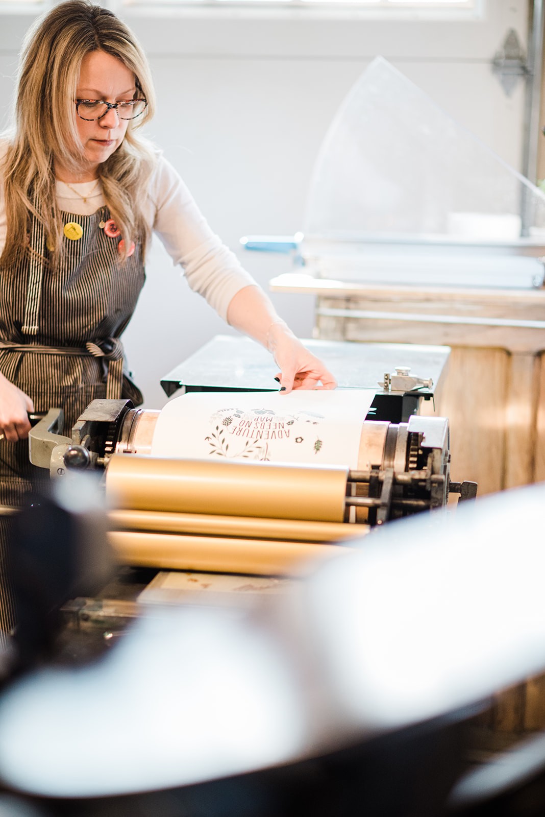 I have been working at earning a full-time living from my small business. To start at the beginning, I studied graphic design in undergraduate school and graduate school both at The University of Iowa. Between undergraduate and graduate school I worked full-time as a graphic designer in a corporate design group at a hardware/software company in Austin, Texas. Working as a designer full-time prompted me to explore graduate school (since I found I enjoyed talking about design and design decisions with my fellow designers), which led me to pursue graduate school. One of the first courses I took was Introduction to Letterpress Printing. Besides expanding my design knowledge, I was really interested in merging design, with physicality of letterpress and the serendipitous moments that come on press. It was a slow procession from learning letterpress to setting up a design and letterpress studio. In 2006, after graduate school I took an academic position as an assistant professor of graphic design at Drake University. I also bought my first press, filed small business paperwork and began printing mainly for friends and family to I continue developing my printing skills. I basically worked out of my home studio from 2006 to 2015 (9 years!) doing events and pops-ups. Then in 2015 I moved into a downtown studio space in Des Moines, Iowa. I built my clients and studio from 2015-2021 with quite a bit of success and great projects.