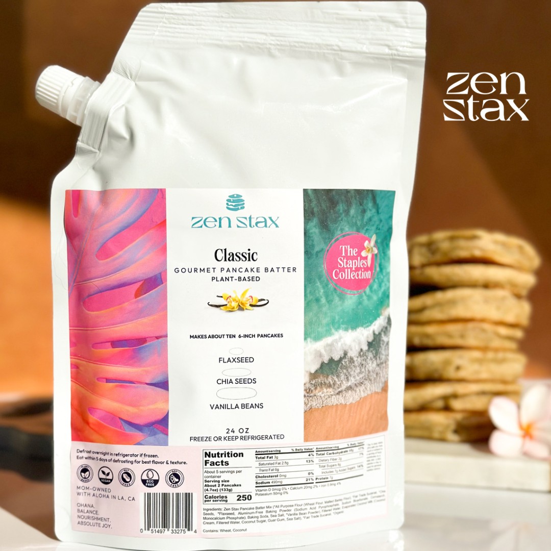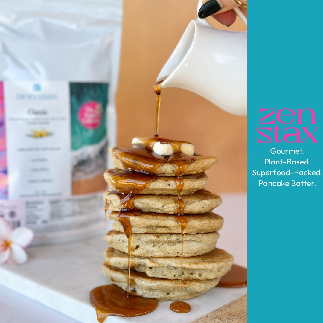 This journey has led me dream up Zen Stax, which is gourmet, plant-based, superfood-packed pancake batter.