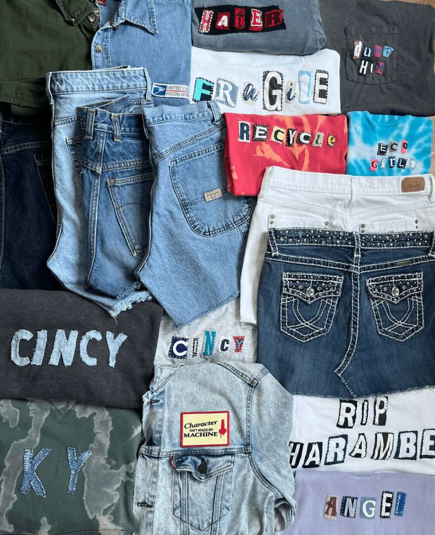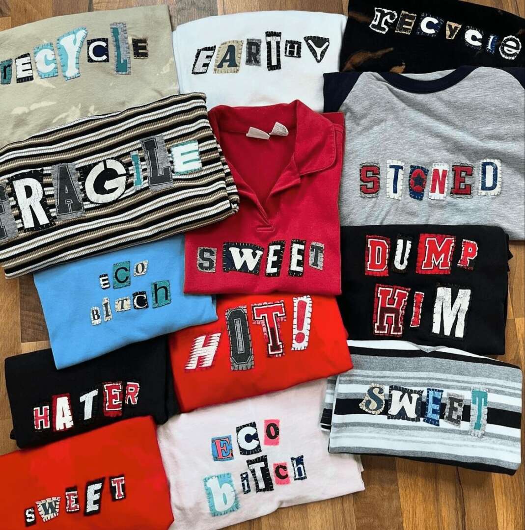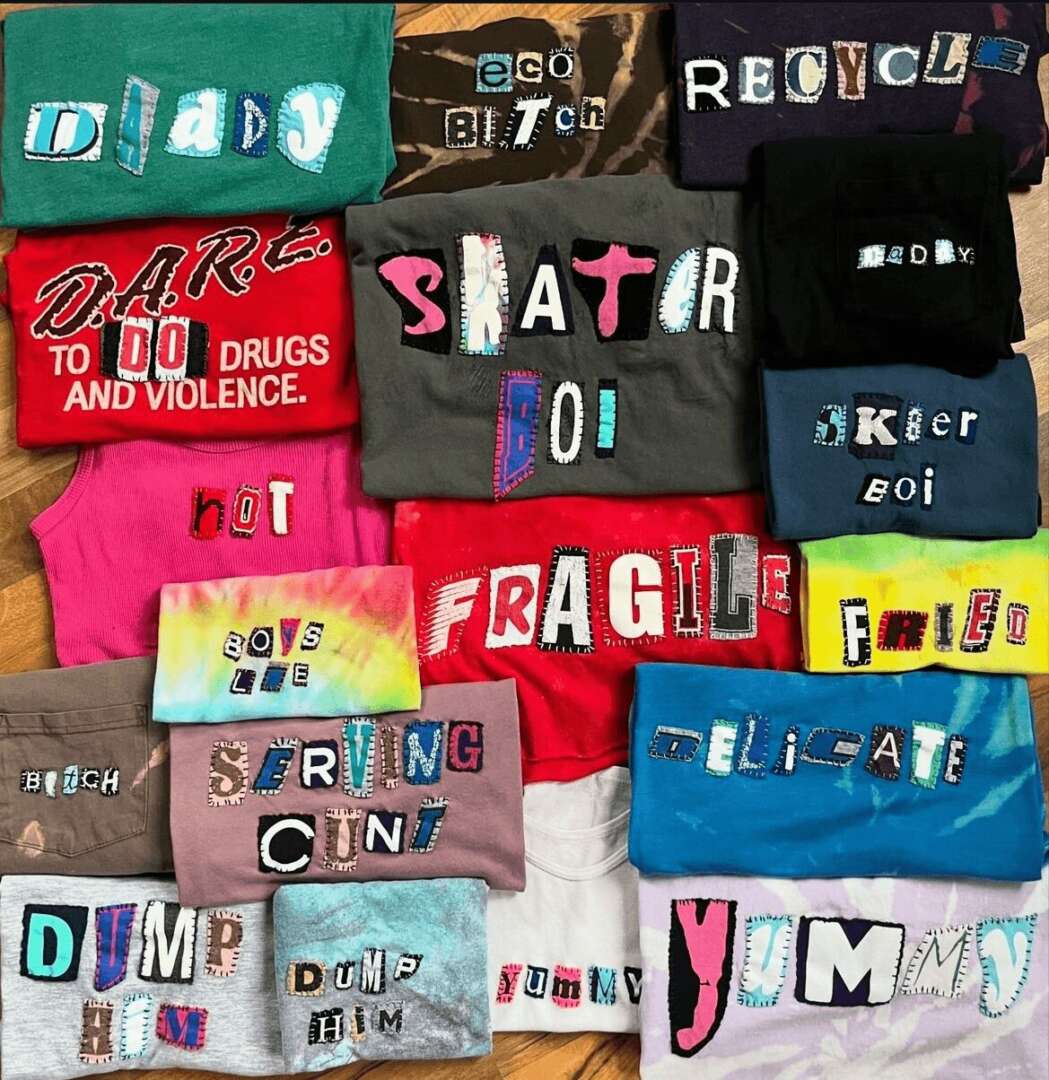 Currently, Reworked has an online inventory of over 200 one of a kind upcycled items including denim, sweatshirts tees and accessories available to the U.S. and Canada. Since I started off working with denim, my heart still lies with denim. But lately my customers have been loving my reworked ransom note tee collection. What has been so fun about operating a tiny little online brand, is that I can see a Tiktok video one morning, run to the thrift store an hour later, rework 10 tees and have them on the website ready to ship the next day. I think this really resonates with Gen Z and how quickly they become obsessed with certain trends seemingly overnight. For example when the internet became obsessed with “brat girl summer” inspired by Charli XCX, my DM’s were filled with people asking when I was dropping “BRAT” ransom note tees. I think I had about a week turnaround time on that trend and right now they’re my most popular selling tee!