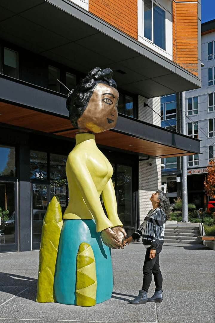 I work in media including clay, wood, oil paint, inks, bronze, and gifs. My work often involves many small pieces that create a larger composition. The materials I choose help me convey my themes, from the organic to the spiritual to a loving and towering female figure made of bronze for Vulcan Real Estate.