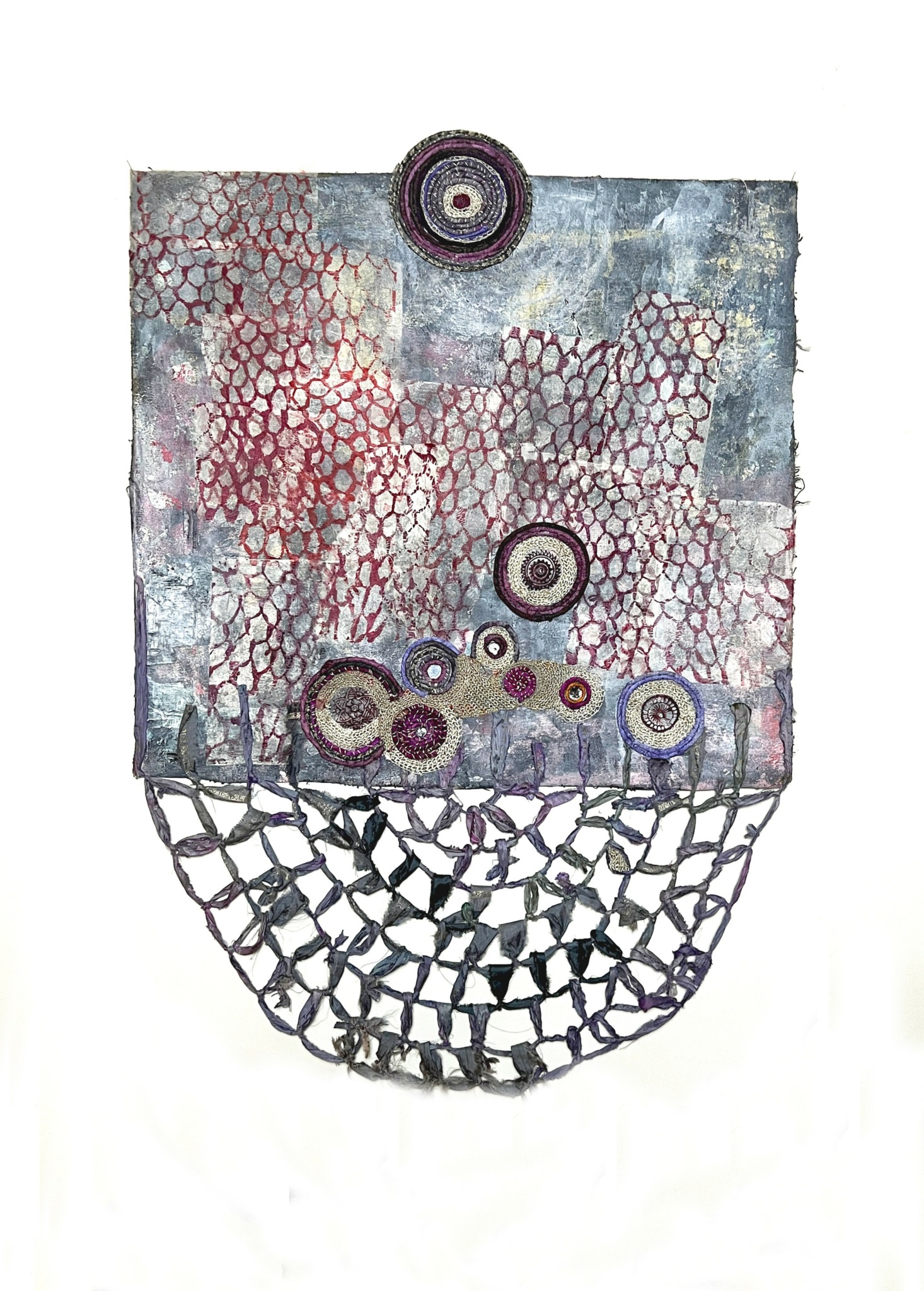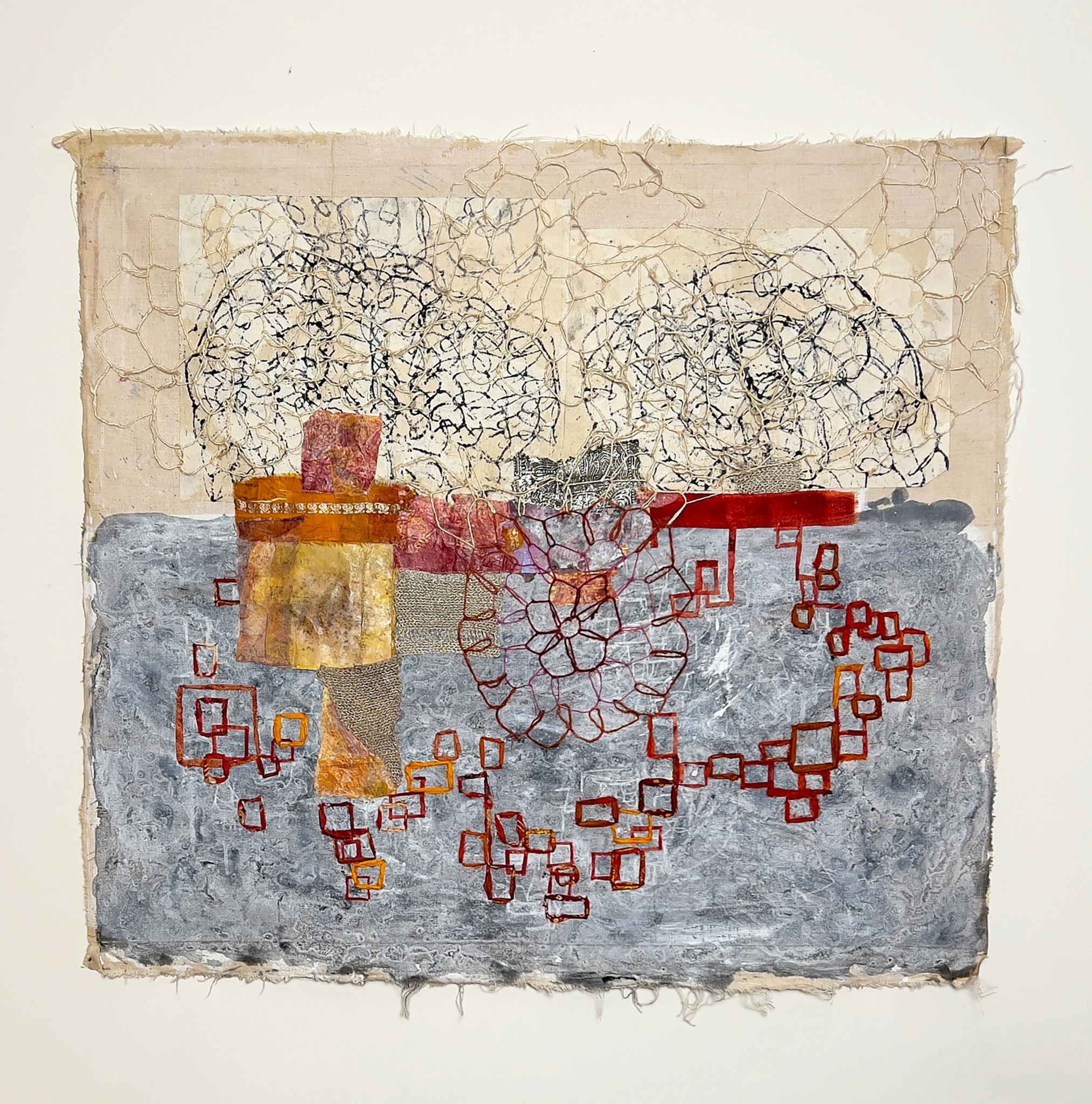 My practice is grounded in interrelated bodies of nets and grids, through which I explore repair, transformation, and the veiled systems of connection that shape experience. These bodies of work are expressions of a consistent, evolving language that honors rupture and restoration. Whether through suspended net forms, gridded fiber-paper compositions, or participatory sound and stitching, my work seeks to soften hard systems, trace ancestral lines, and disrupt what no longer serves.
