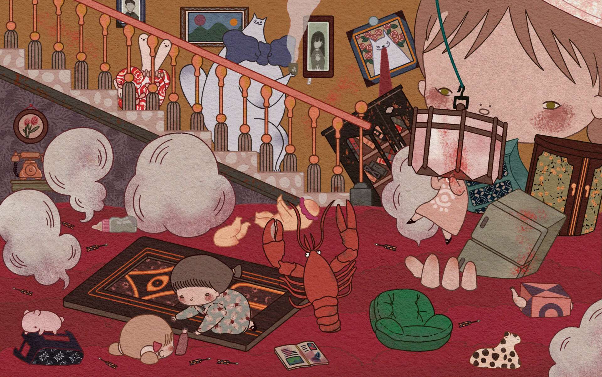 The project HOUSE is my graduate thesis project in Fashion Institute of Technology; it is a series of illustrations,inspired by a horror movie directed by Japanese director Nobuhiko Obayashi, which uses collage to make an otherwise scary scene funny. The story is about 7 girls who went to the protagonist Oshare’s aunt’s big house in the countryside during the summer vacation. Then, strange things began to happen. The girls are swallowed up by the house one by one, and eventually, were all turned into dolls. It turned out that the aunt’s fiancé died in World War II. She was heartbroken and turned into a ghost, constantly tricking the girls in the village to come to her house and devour them. She hoped that the girls would always be with her and she would never be alone again. This is a tragedy caused by war. The story is sad, but I used an absurd and comic way to describe the scene. The facial expressions of the characters are witty, while disdainful, and the overall color is bright and warm. This result is a unique treatment that offers another possibility of expression.