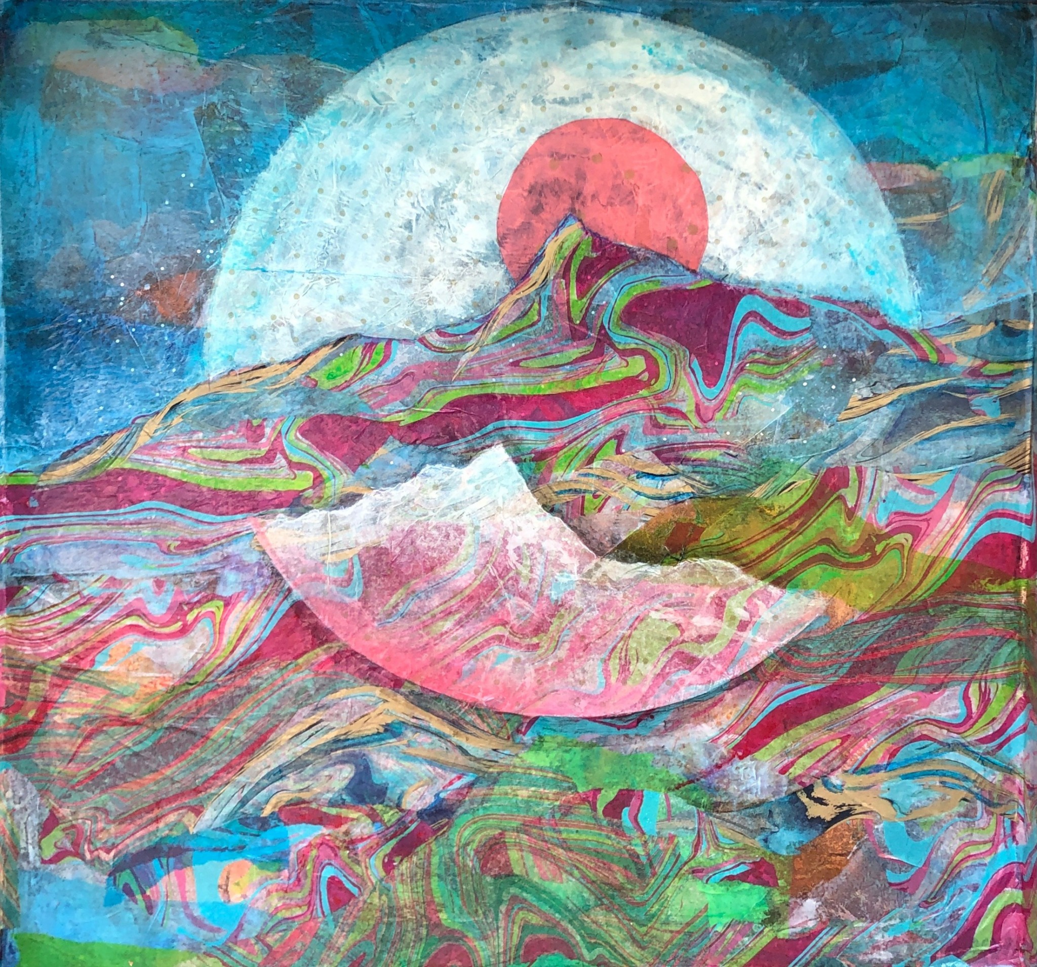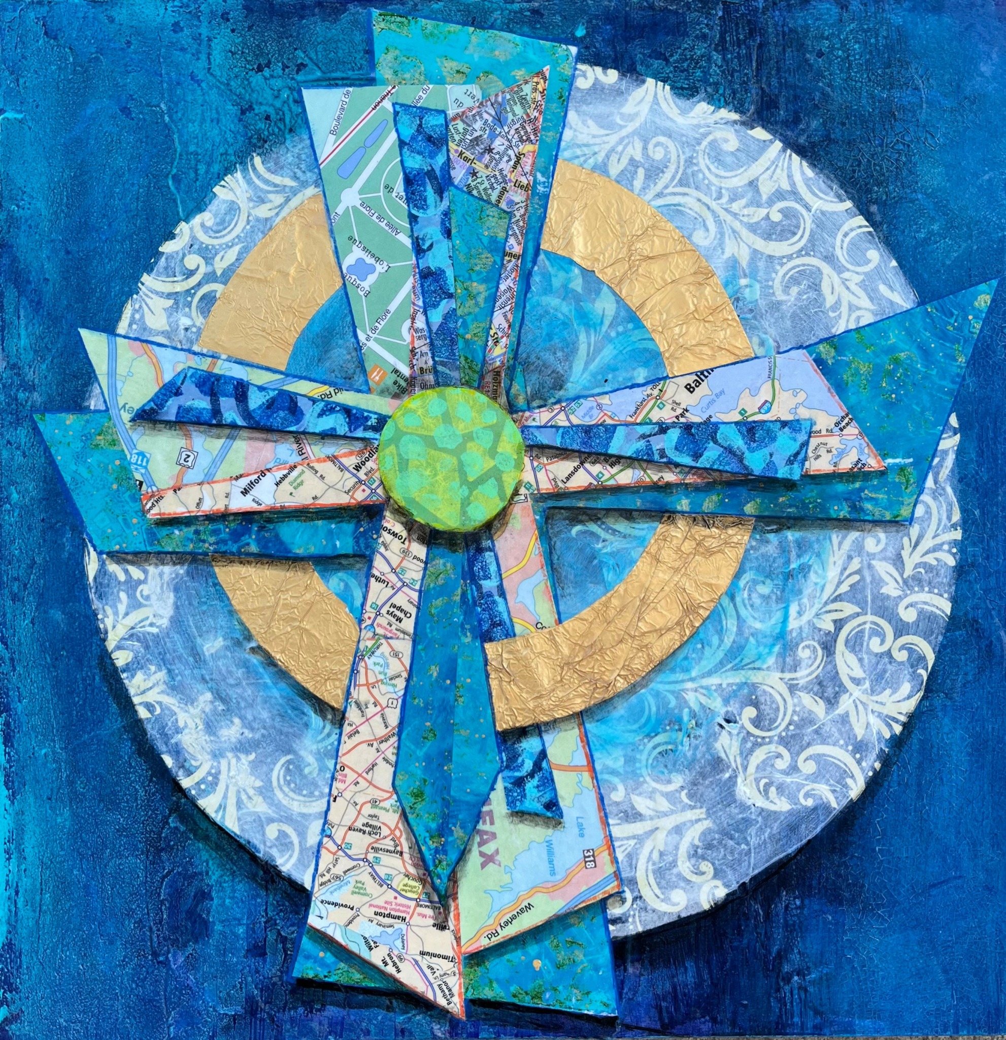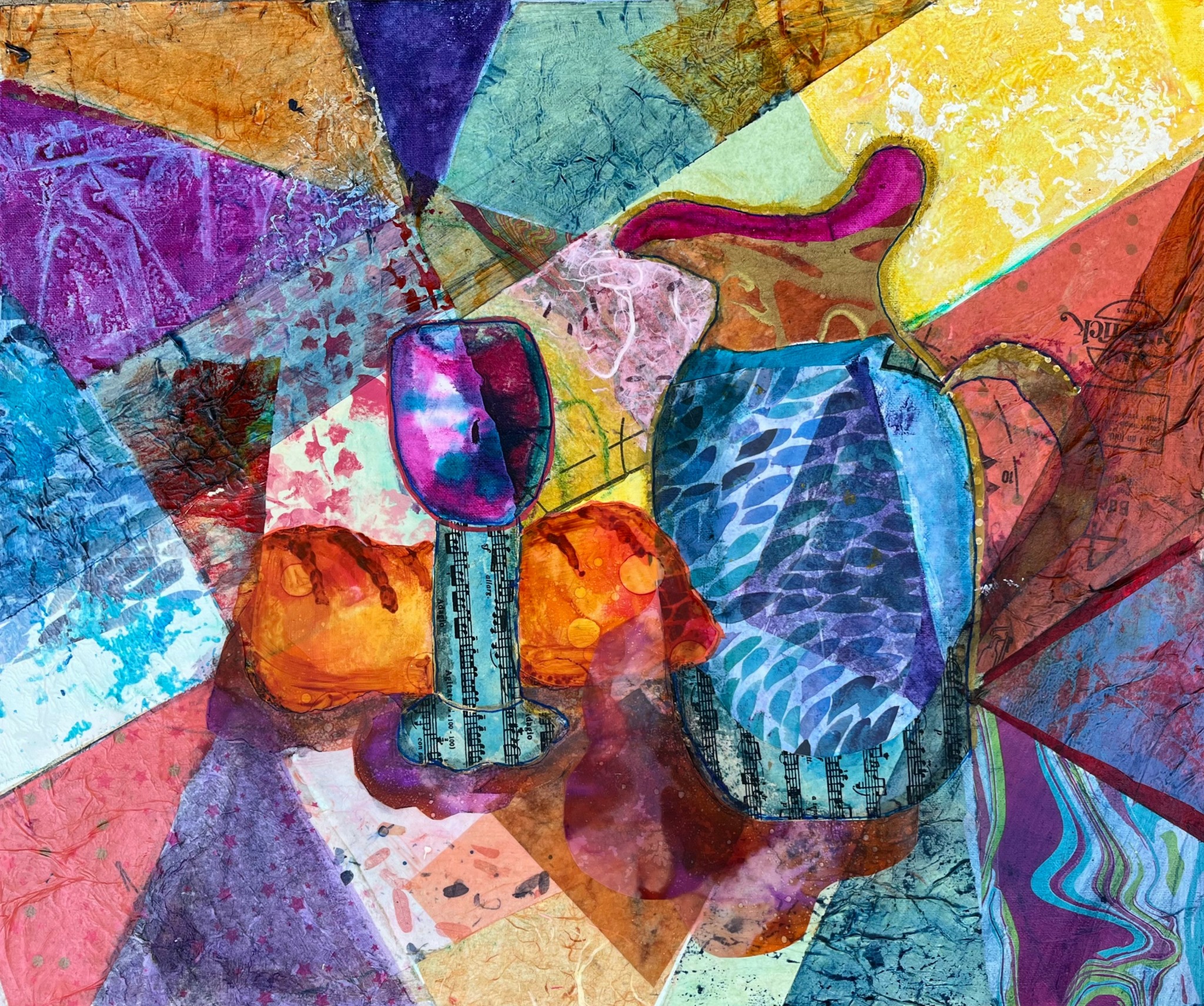I am an abstract artist. I don’t like to be constrained by reality! I use acrylic and just about anything that has texture and interesting shapes. I use papers of all kinds, bubble wrap, scraps of lumber and even rusted out garden borders. Once I used an old drawer. I set it up on the front panel and then created a painting on the inside of the drawer and then created another one on the outside of the drawer. All of my paintings have a Christian theme because each one accompanies one of my devotionals.