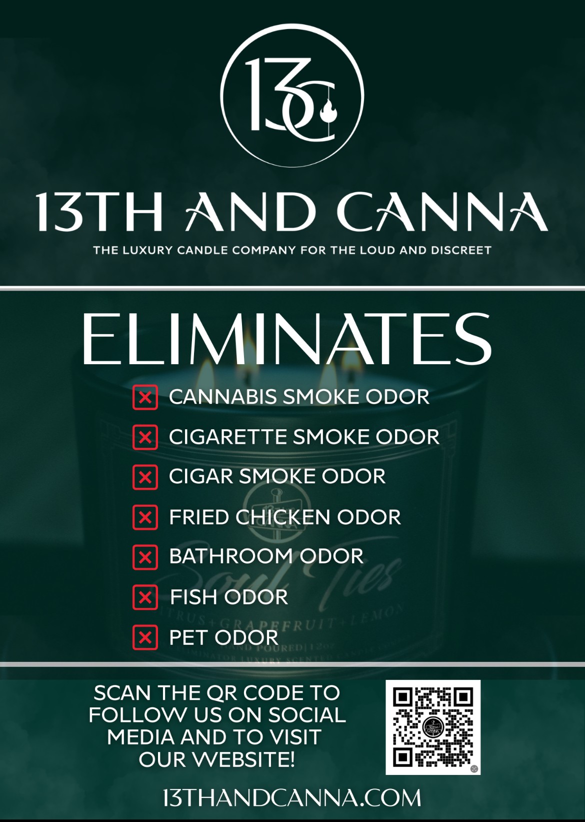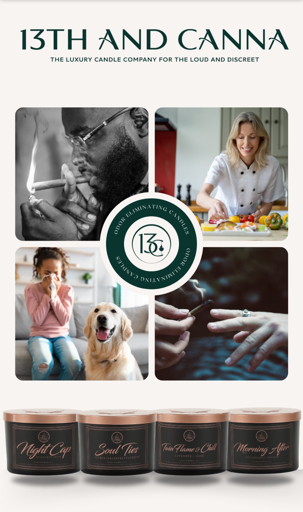 At 13th and Canna, every detail matters. Each candle is crafted with love and intention. From bold, conversation-starting names to luxurious, long-lasting aromas, our products create moments that linger long after the flame is gone. **During testing, we found that our candles not only eliminate cannabis odors but also tackle pet, cooking, and other household smells. Our customers have confirmed—this product is both effective and essential!
