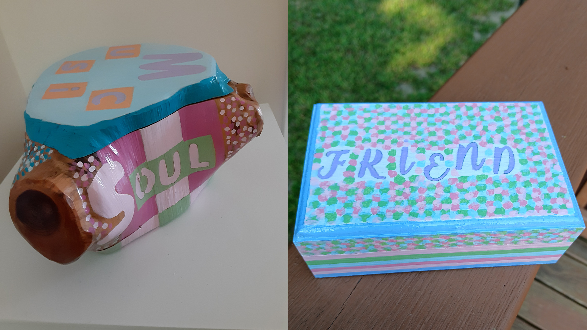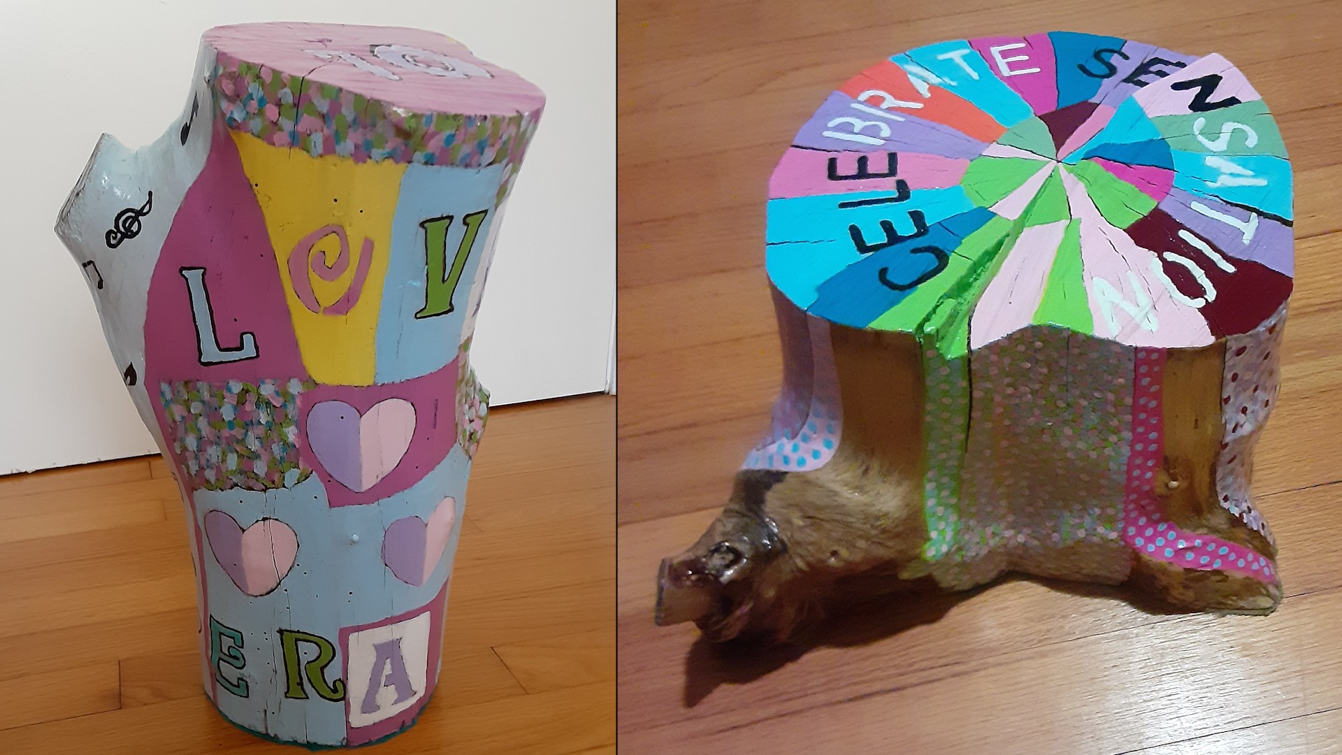 I am most happy when creating and several years ago, I started to do ‘tree trunk art’. I find smaller pieces of cut trees and peel the bark, sand them and then paint them in different ways. When not writing, editing, consulting or directing, I work on my tree trunks. Along similar lines, I make hanging mobiles made out of wood and shells and other natural items that I find. Recently I began painting unique designs on small wooden boxes. Prior to this, I designed t-shirts, made wooden dog racks and Boo cards, named after my first dog, Boo Radley. I sold some shirts, dog racks and cards, but that was not the reason I created them.