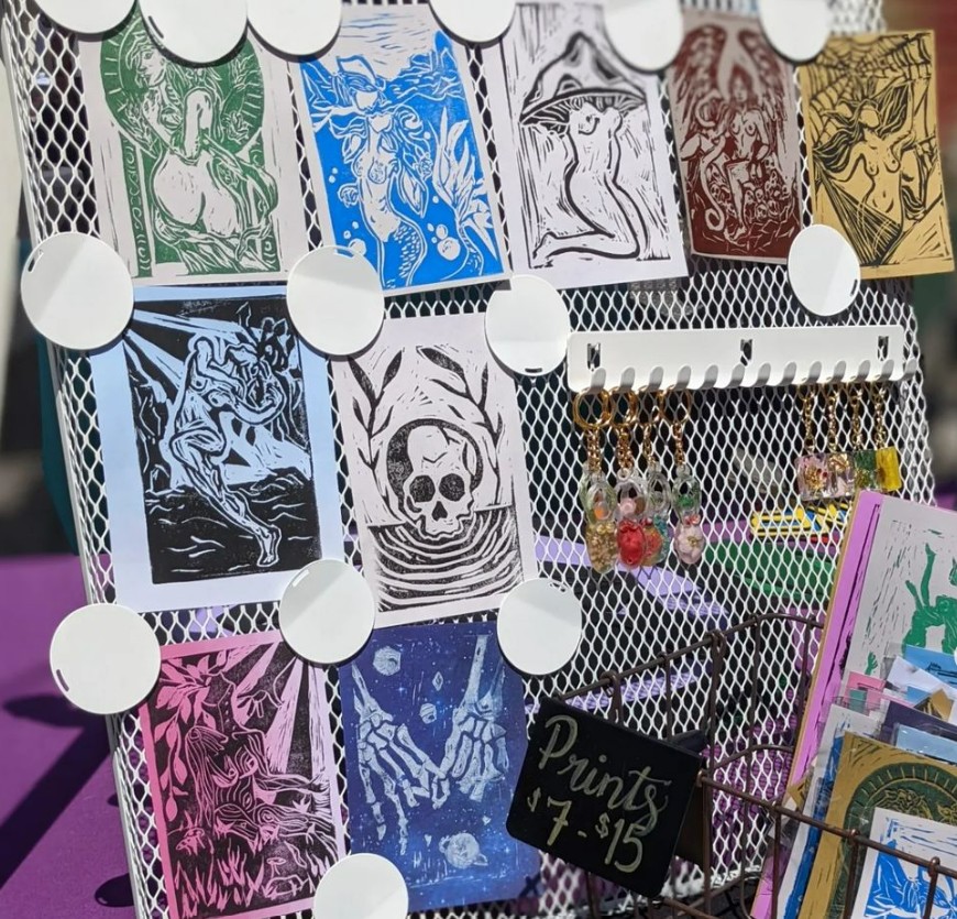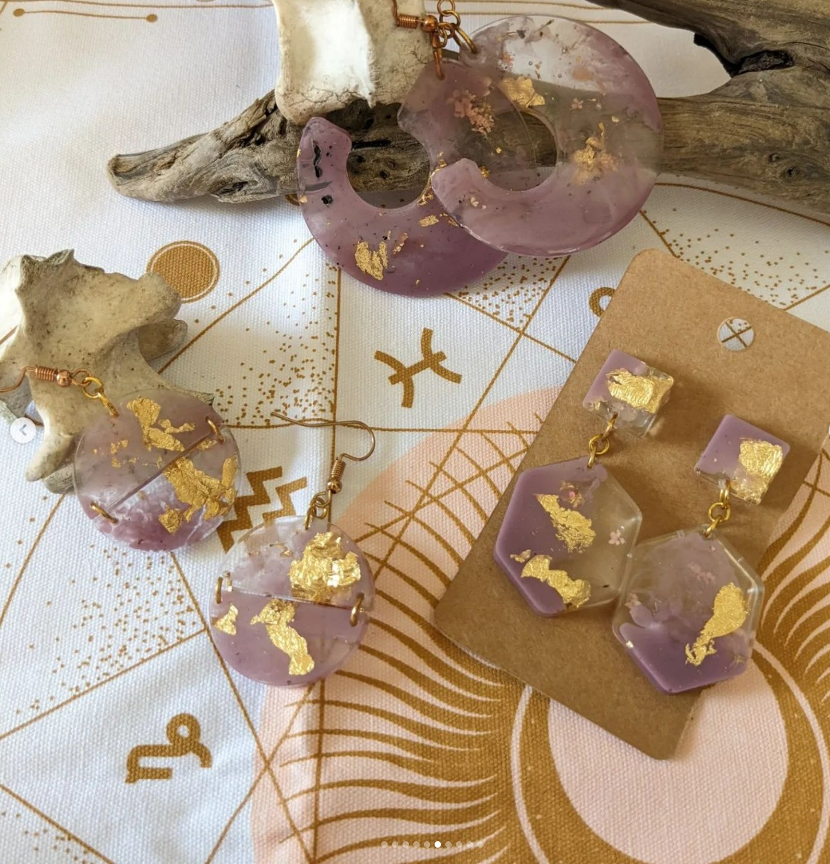 I have a degree in Ancient Studies and was teaching Social Studies for six years. I had mentioned before that I was at a low point in my life so when the holidays were coming up I decided to try to make gifts for everyone with a mindset of knowing it would probably look bad but that’s the brand right now. I started with resin, which is a ridiculously hard medium to experiment with in hindsight. I created coasters and earrings as gifts and found that I loved the experimentation of creating, the first iterations were terrible but I got better. I decided to make earring collections of goddesses, inspired by mythology, literature, and my archaeological background. I’m proud of my earrings, they’re pretty, but more importantly, the people that buy them want to channel those deities and tap into something powerful within them. The idea that I was making people feel empowered when I, myself, was feeling at my most powerless was pure therapy. I make a variety of things now, home goods, metaphysical tools, and jewelry with resin. I also carve my own linocuts and make prints with them, again goddess inspired. I try to use historical data, natural ingredients, and my intentions to create something meaningful for every person who visits me.