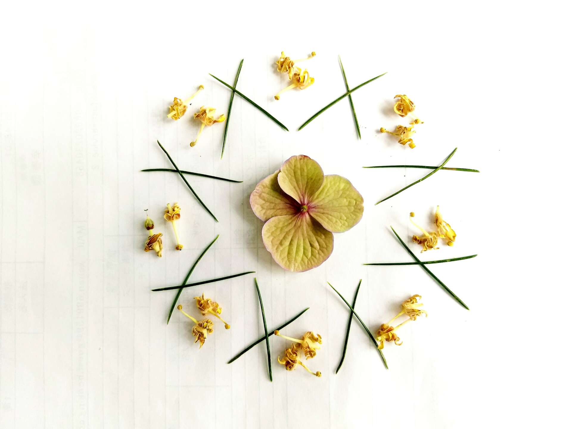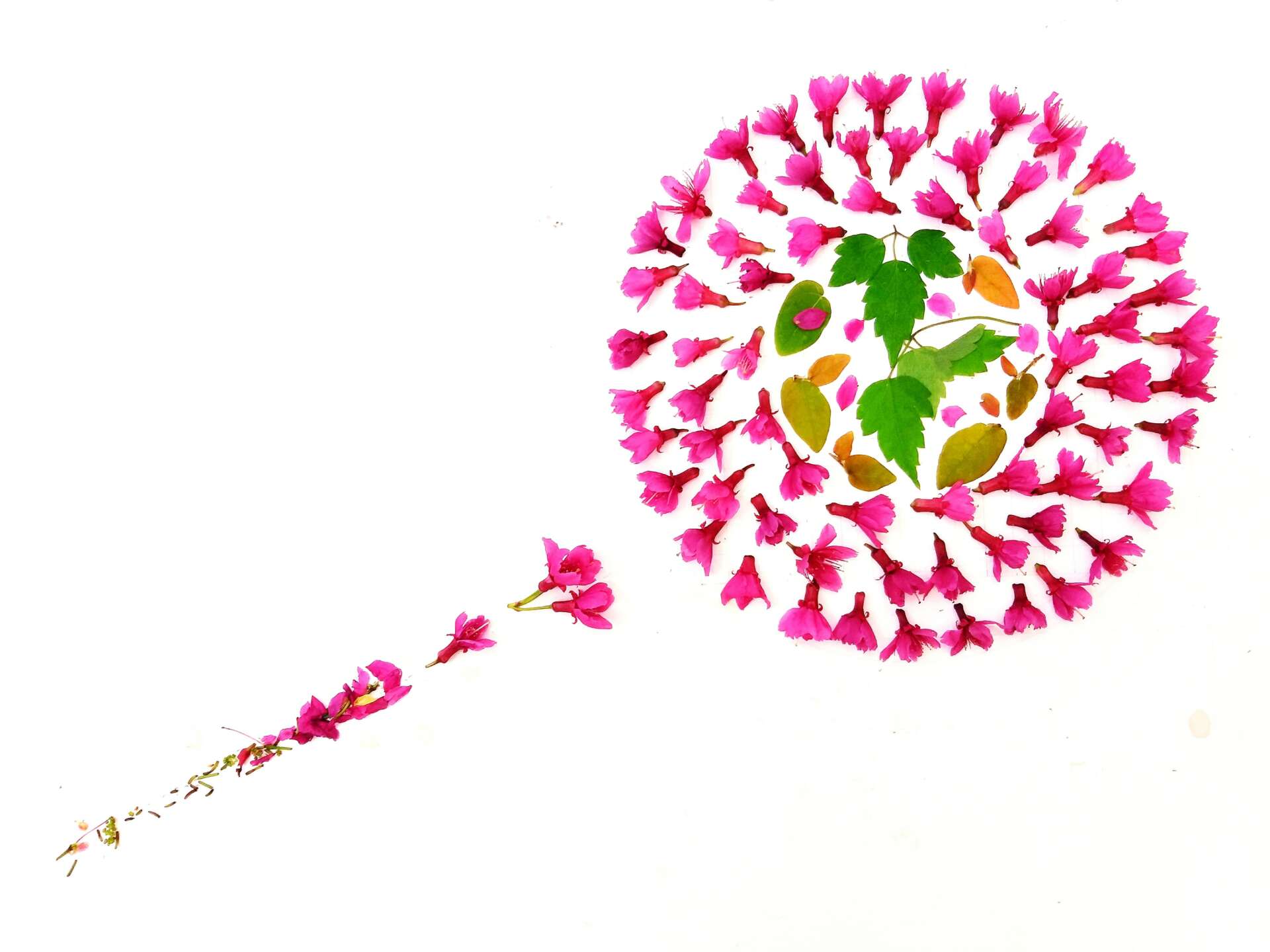 I needed to recovery after surgery. So, I walked or cycled outside every day to maintain balance and think clearly. Collecting some flowers some leaves and put them together on the paper, I found the patterns and colors were so beautiful.