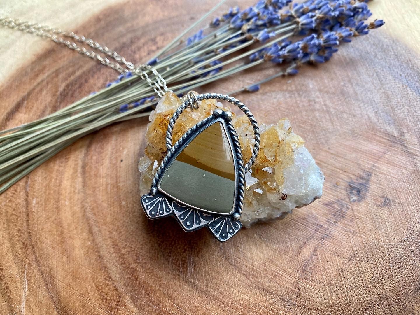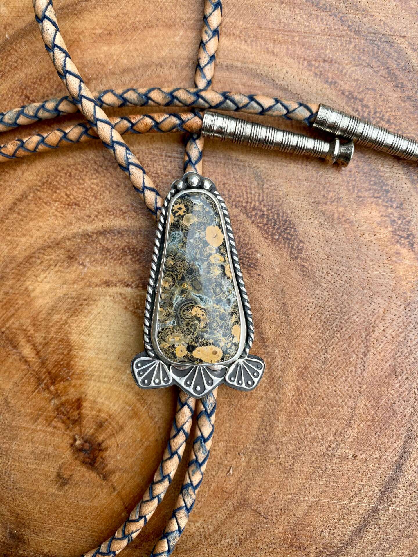 The most meaningful project I have had the honor of doing was actually very recent. Two of my best friends recently brought a beautiful baby boy into the world and they wanted to ask some friends to be his godparents. They wanted to make the occasion extra special so they asked me to make some matching pieces for them with some stunning picture jasper, a bolo and a pendant. Of course they said yes and now they have a piece to commemorate the occasion! Fast forward a couple weeks, the father wanted to get his wife one to match, I made her a matching pendant with the same batch of picture jasper for her with the little ones initials on the back. I had one more piece of the picture jasper so I knew that I needed to make him a matching bolo as well with his sons initials also on the back. So overall, I created four semi-matching pieces all from the same batch of picture jasper, all to celebrate little Lyle. My heart is so full and it is such an honor to be trusted with such special occasions.