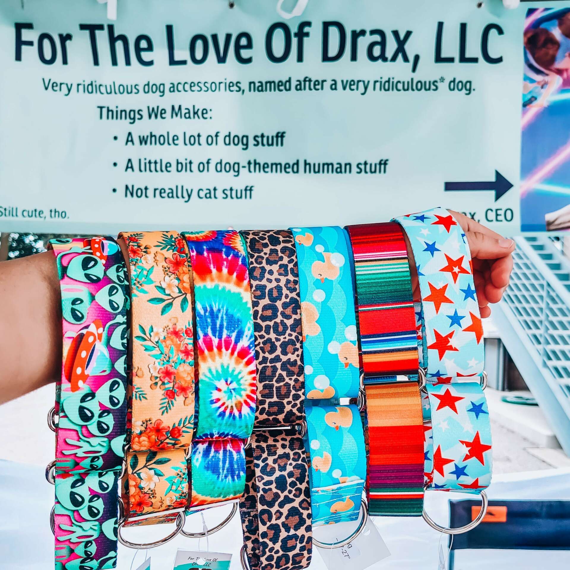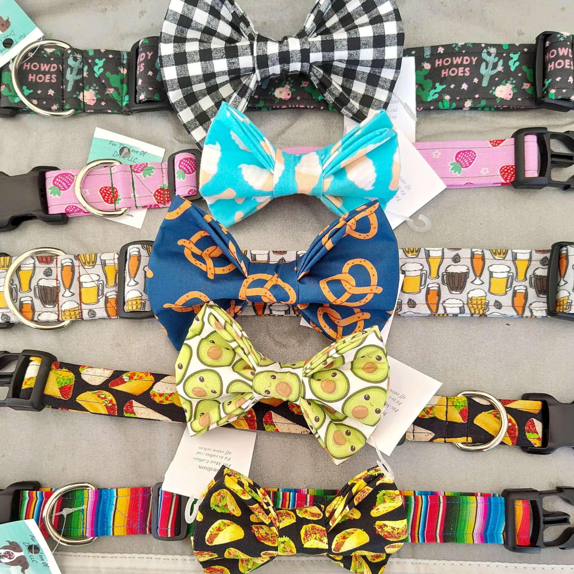 I adopted my dog, Drax, as a puppy. He was born in a shelter and very early started showing signs of having medical issues. To pay for an allergy test, I learned how to sew and started making bow ties for dog collars because I had seen how cute my dog looked in them. Drax then needed a year of immunotherapy drops. The medical issues continued, so I kept learning and expanding my products to pay for his care. He’s now had 3 knee surgeries, 2 small tumor removals, and goes to the vet monthly for an anti itch shot while our product offerings have grown from bow ties to bows, muscle tanks, quick release collars, martingale collars, over the collar bandanas, and more with the business becoming my full-time job.