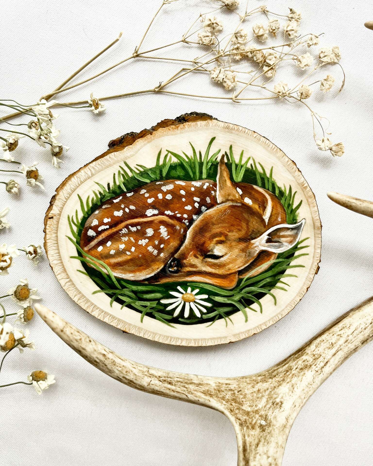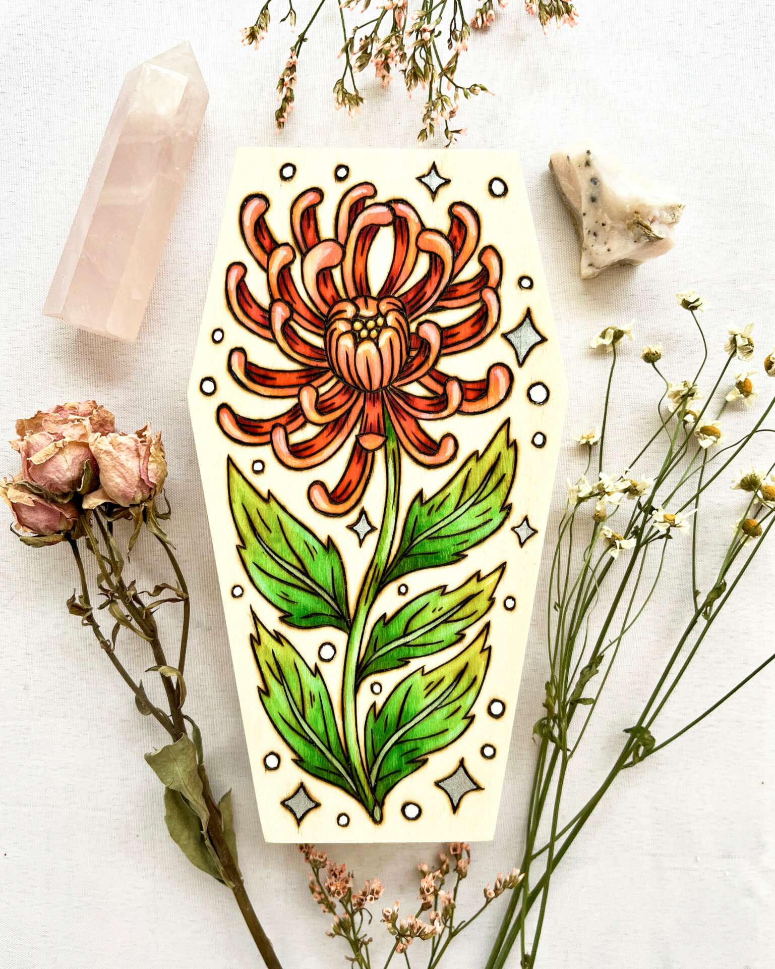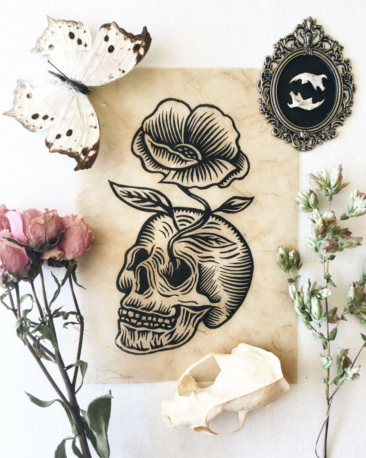 Visually, I am drawn to soft colors or muted tones. I love finding the balance between abstract & reality, and often mimic Impressionist paintings in my brush strokes. Discovering, combining, and experimenting with different media allows me to push the boundaries of what I can do while shaping my artistic sensibilities. I am most frequently inspired by nature, folklore, magic & whimsy, vintage curiosities, wunderkammer oddities, tattoo culture, and nostalgia with a hint of spookiness. My primary interests include illustration, printmaking, woodcutting, and pyrography. Recently, I have been focusing on character portraits, plein air paintings, botanical & animal drawings, fantasy themes, and integrating the elegant macabre into my work.