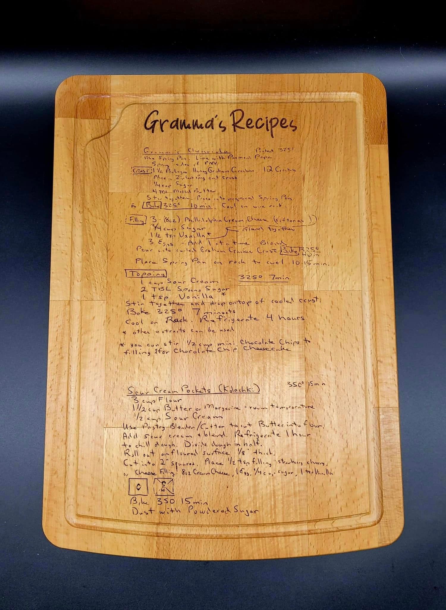 I have made detailed designs on wood, powder coat, mirror but the most memorable pieces are the cutting boards with generational recipes. When the clients give these to family, it is very emotional but heart warming.
