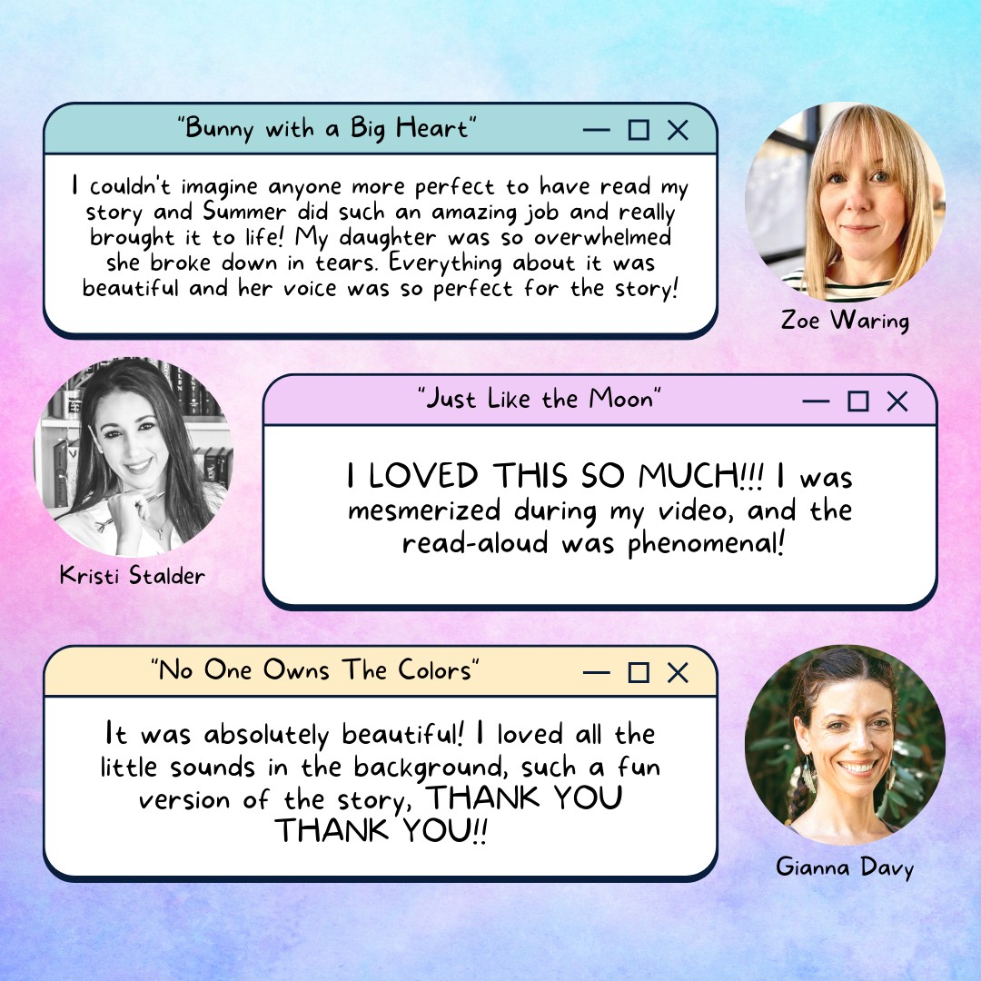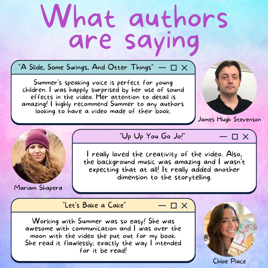 Hi my name is Summer McKenna and I’m a passionate children’s YouTube storyteller, content creator, and social media book promoter and reviewer. In December of 2021, I started my YouTube channel with a goal to help spread my love for picture books and literacy with others, and is why I love what I do. When I first started out, I would record my favorite picture books I loved as a kid and create simplistic read-aloud videos, void of any sound effects. It wasn’t until a few months later when I had my first ever author, James Hugh Stevenson (A Slide, Some Swings, and Otter Things) reach out to me, asking if I could read his debut picture book on my YouTube channel. I remember being shocked that somebody was even interested in having me read their story on my channel, but excitedly accepted. After that video was when everything changed. Suddenly, I was receiving DM’s, emails, and Facebook messages from authors I didn’t even know, asking to have their stories considered to be read on my YouTube channel. Small independent publishers and marketing publicists from large publishers alike were somehow learning who I was and becoming interested in my services. At first, it was a little overwhelming, until I realized how many authors and illustrators were genuinely interested in my videos and were willing to pay me for my services. It was at that moment that I made the decision to invest in my YouTube channel. I purchased professional recording equipment, music/sound effect services, and upped my social media content design skills. Now, I was promoting both my YouTube channel and my “Summer Storytime Package”. With the purchase of my package came a story time video complete with fun, engaging sound effects, background music, and a clear read-aloud. While this option guaranteed an author’s own personalized story time video to use/share at their own disposal, I also created a special YouTube feature package. With this package came all the same things as the original, but with additional perks that included being featured in my YouTube video lineup, and full social media promotion of the author/illustrator. Since I launched both of these packages, I’ve worked with so many incredible authors who I’ve learned so much from. My story time services set me apart from the rest of the crowd in the way that I treat every book like a fun little movie, complete with engaging sound effects, background music, and eye-catching marketing thumbnails. Treating each and every picture book like a small short film makes the editing experience so much more fun for me and always ends up feeling so rewarding in the end. While I’ve always been interested in film editing, I found that through the creating of my story time videos, I can live out my dream while challenging myself every time and continually learning nonstop. From my YouTube channel, I’ve been the most proud of the connections I’ve made with authors, illustrators, and publishers from around the world and is something I’ll always be so grateful for. I’ve even had clients tell me they still currently use my story time videos to use whenever they visit schools and libraries as well! When working with a client, I always want them to feel a sense of comfort and ease, knowing that their book will be transformed into a magical read-aloud. Every picture book I take on, I always give one-hundred percent towards and is something I strive to achieve for both older and newer clients alike. I know how much a picture book can mean to an author, illustrator, or reader which is why I set my work ethic so high in order to achieve only the best possible outcome. To any potential clients out there who have been looking for a fun and fresh way to market your new picture book, check out my YouTube channel to see what type of videos I produce. I’m always eager to find the next AMAZING picture book with outstanding video potential and creativity bursting from the pages.