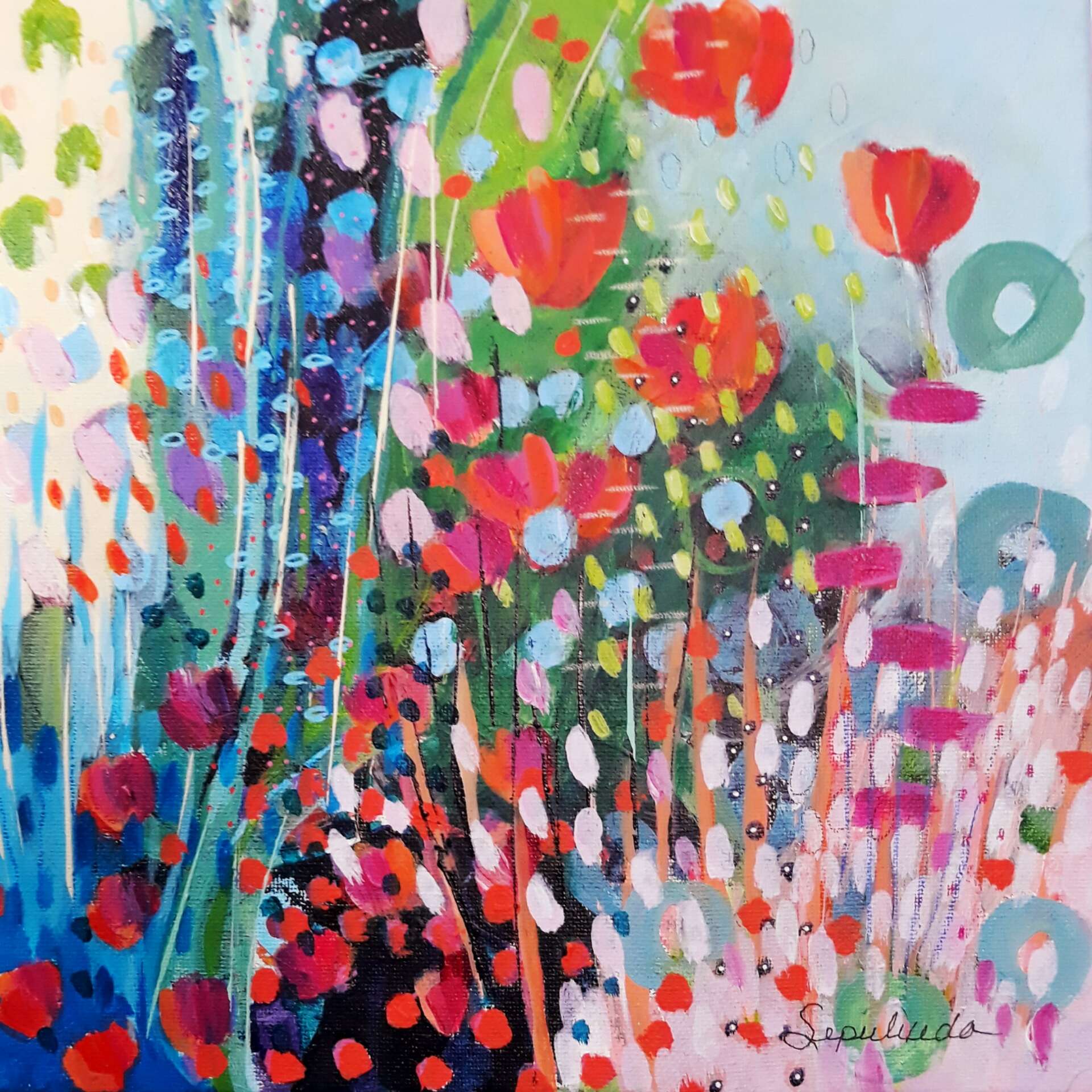 I looked for inspiration from my childhood memories and the things/experiences that brought me joy. I’m looking for happy reminders that surround our communities, using an intuitive process. I dissect my happy thoughts and reconstruct them using a series of color, line and shape to create visual depth. I let the painting guild me as it weaves itself together reflecting the impression of flowers, reflections of nature and aquatic underworlds. These tranquil and angelic paintings offer a place of rest for the trouble heart and a refuge for the spirit.