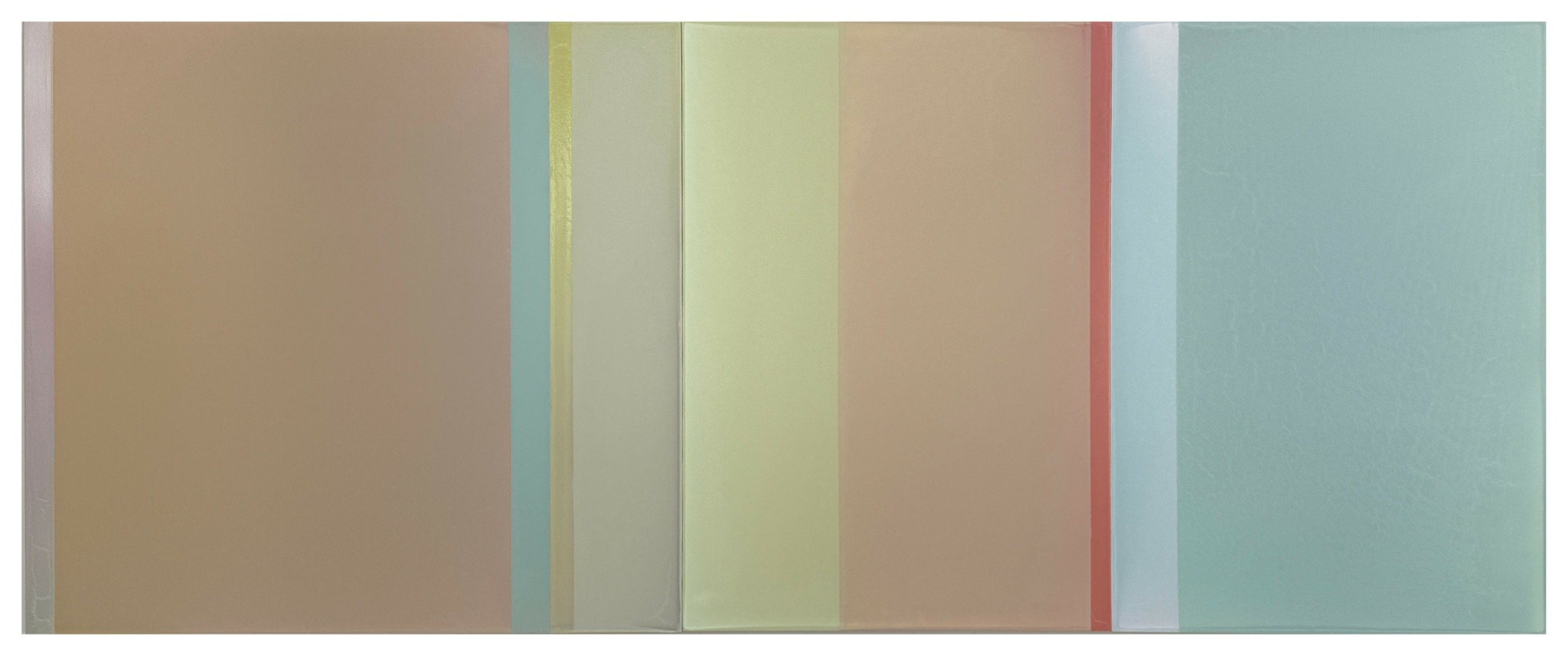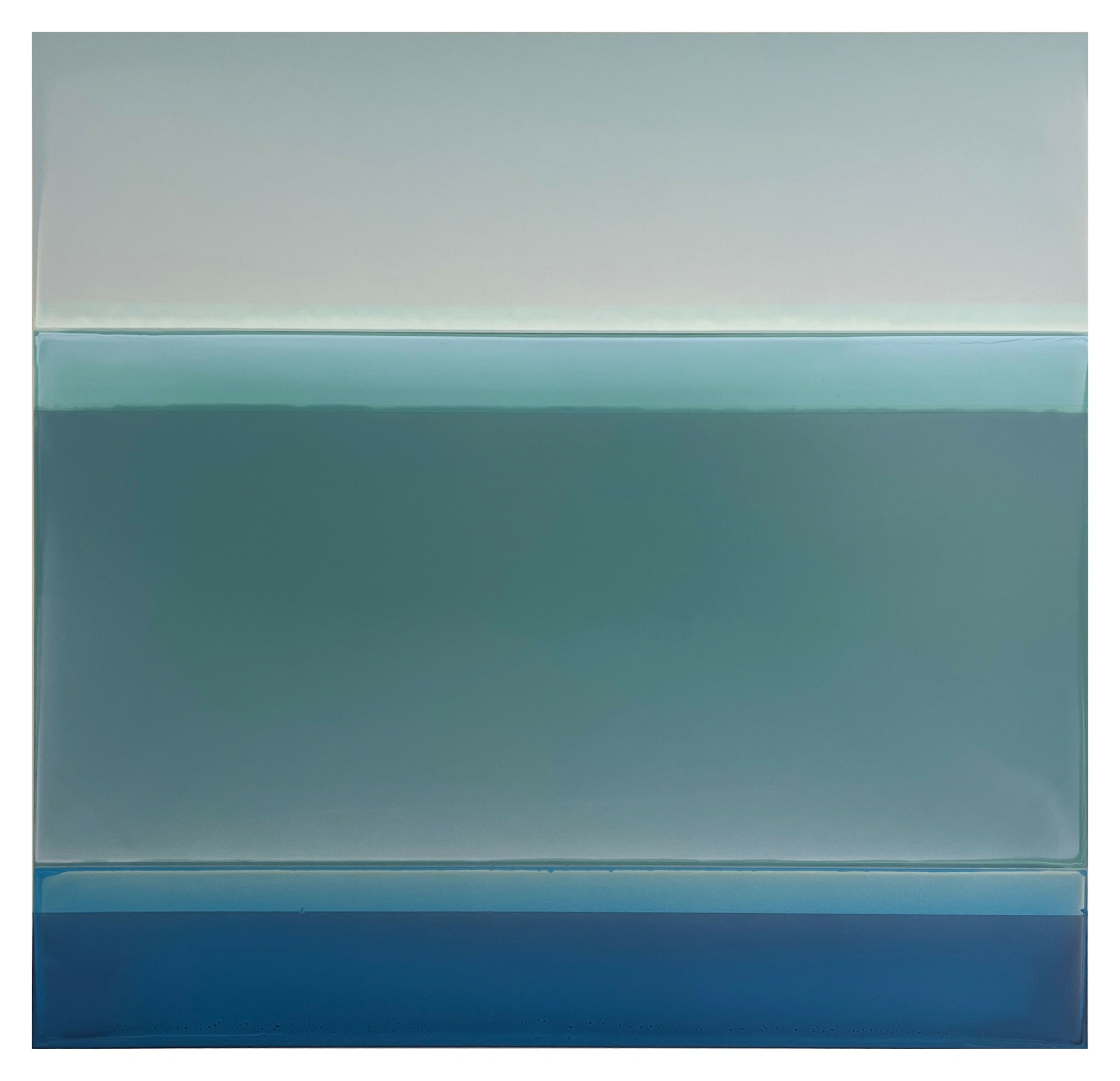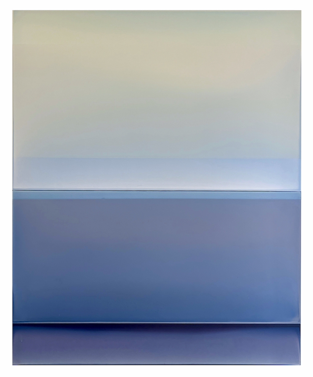 My abstract work is about color, light and surface and is inspired by my relationship to landscape. Over the past 15 years, I have developed a process of pouring layers of tinted polymer on panel that has expanded the breadth of what I can achieve with color and surface. After pouring the tinted polymer, I manipulate the panel so the paint collects or cracks. I do multiple transparent or semi opaque layers which create a depth and complexity to the color. The poured polymer mimics nature: a layer of polymer hardens like ice or mud —its thickness and viscosity impacting how the surface dries. The variations on the surface and the quality of the color are the result of a delicate and flexible relationship between control and accident. I assemble the poured panels into specifically calibrated horizontal or vertical sequences, creating a narrative of color, space, and light. The surfaces range from dull to glossy, either absorbing or reflecting the light, existing always in relationship to the light in the room and the position of the viewer.